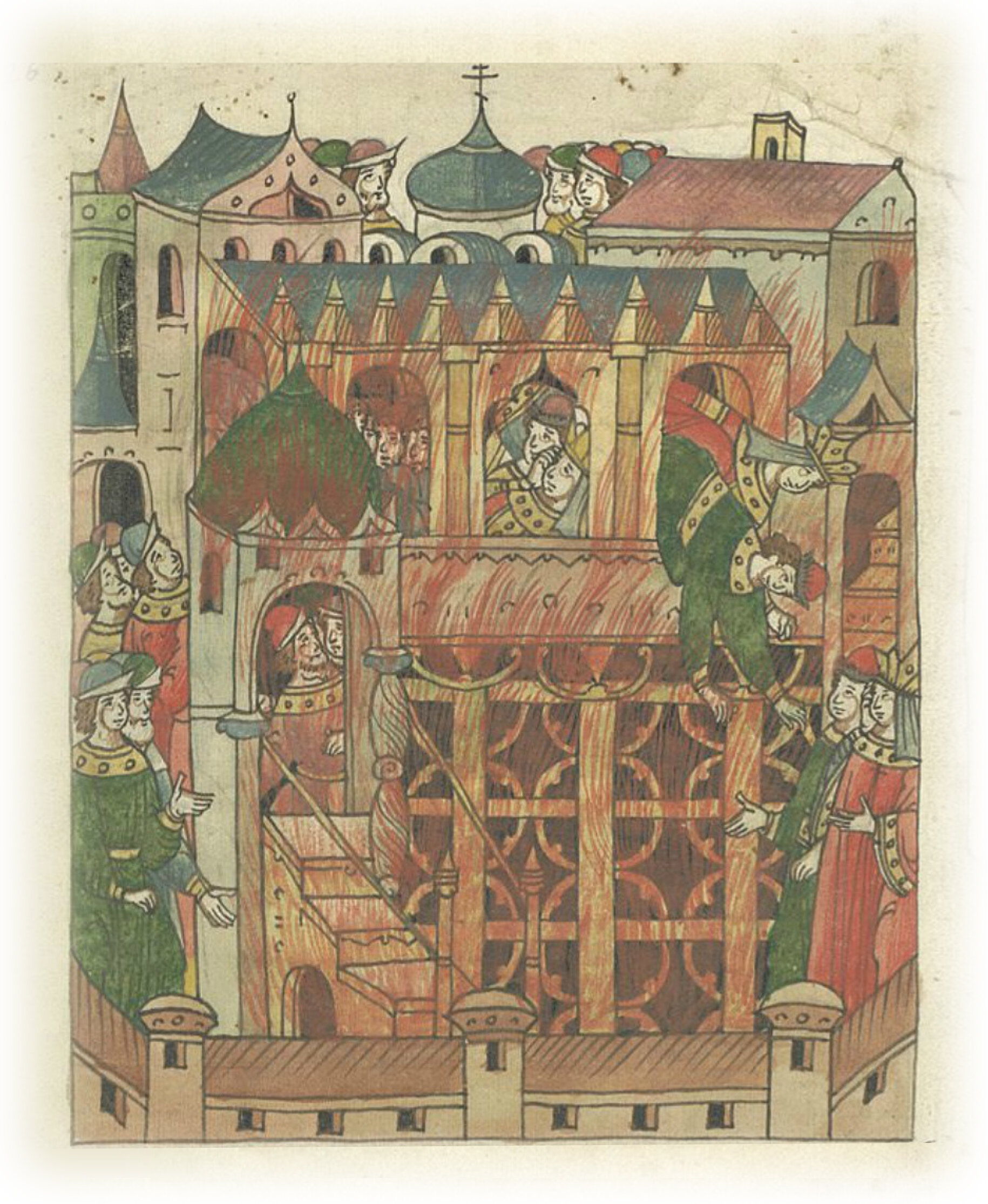 В 6806 (1298) году. Загорелись сени под великим князем Михаилом Ярославичем Тверским, и сгорел двор князя Михаила Ярославича весь. Божиею же милостию пробудился сам князь Михайло и выкинулся с княгинею своею в окно. А сени (были) полны княжат и боярчонков спавших, и много сторожей, и никто же не слышал, и иные так выбежали, а другие сгорели, и казна княжеская вся сгорела, и одежды, и все погорело. Сие было на Святой неделе, в субботу на ночь.