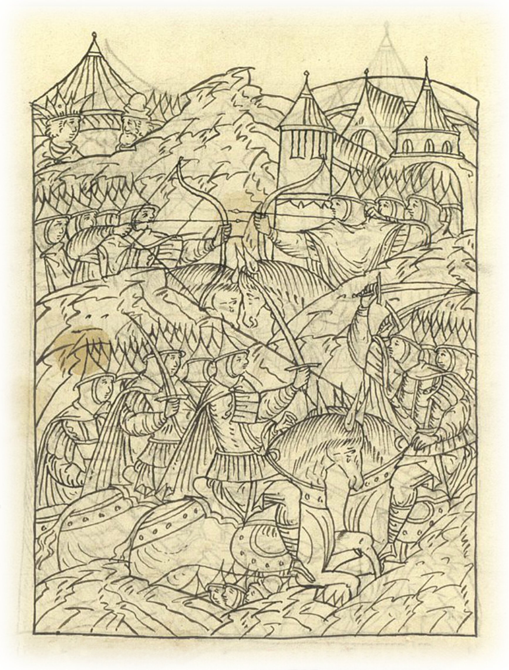 И делали вылазки на передовой отряд из города Казани многие люди казанские, и бились обе стороны стрелами долгое время, и сразились.