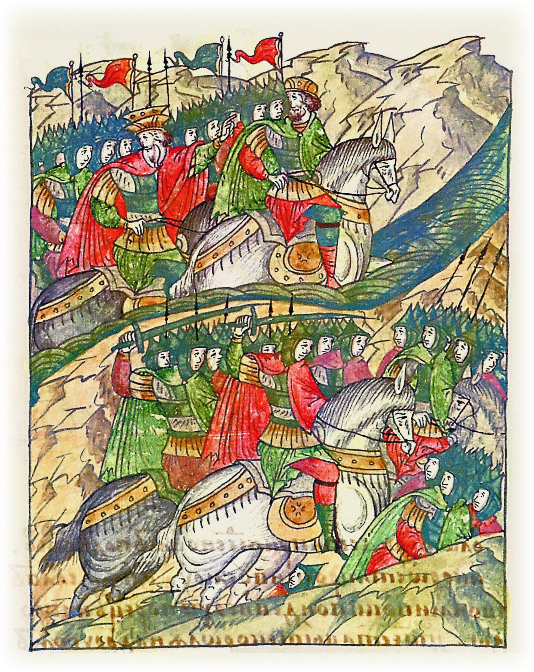 Великий князь Изяслав с полками идет вброд. Король велит своим полкам делать то же самое.