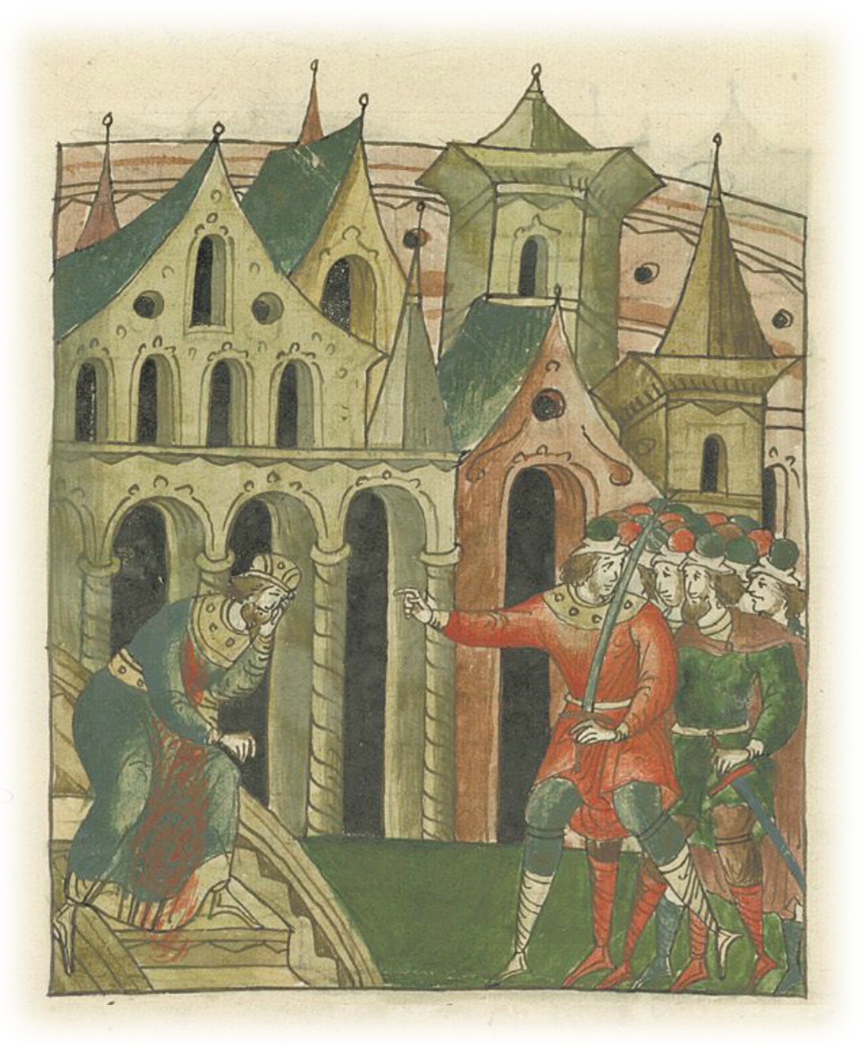 Убийство великого князя Андрея Юрьевича Боголюбского во Владимире Кучковичами. Убийцы, сочтя князя убитым, выносят тело своего друга и уходят прочь. Испуганный князь выбегает за ними, стонет от боли и идет под сени. Они же, услышав его голос, возвращаются