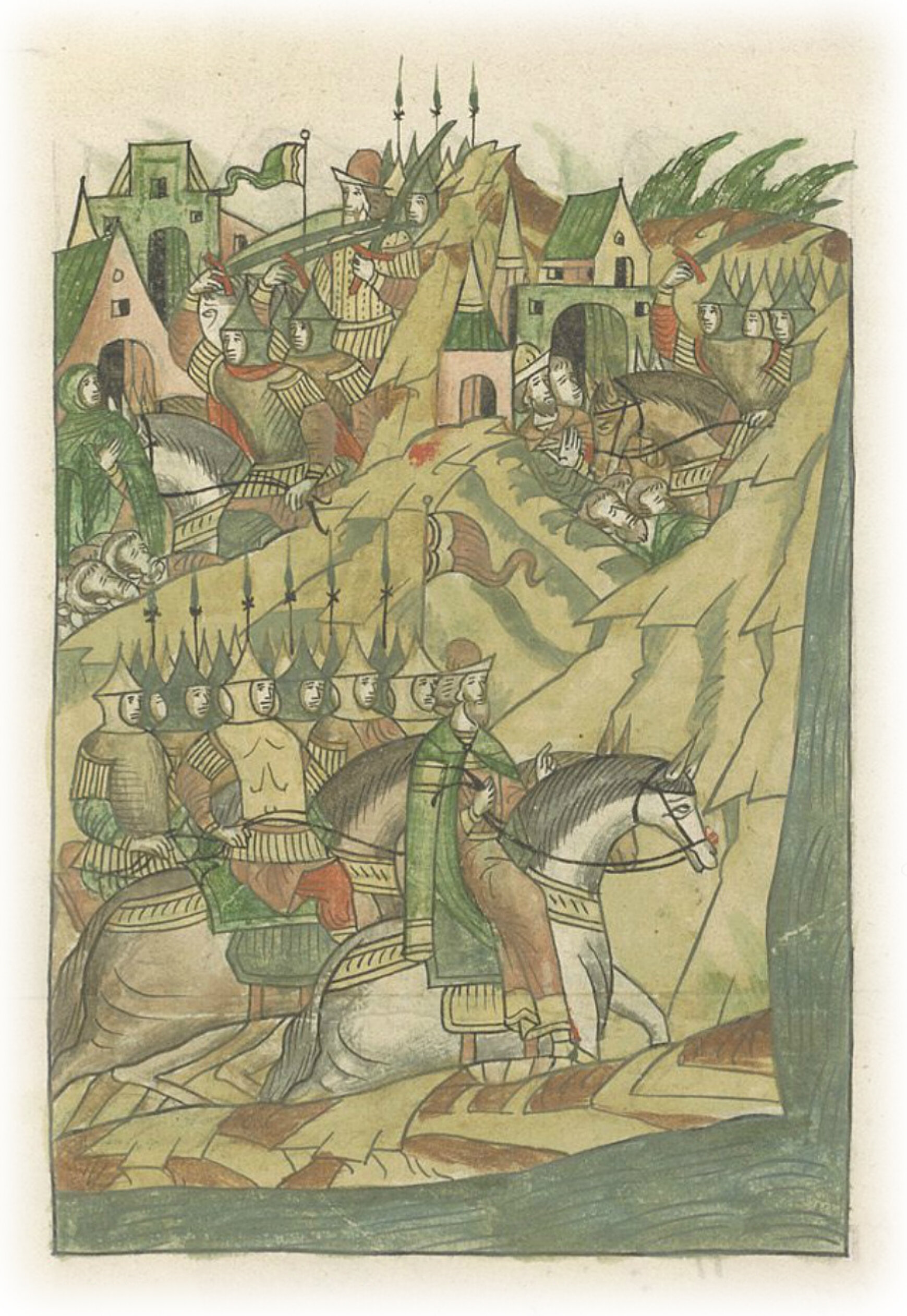 Языки говорят воеводам царя Ивана Васильевича, что магистр окопался большим рвом вокруг города Рындола, бьет из пушек и пищалей и приступает к Рындолу.