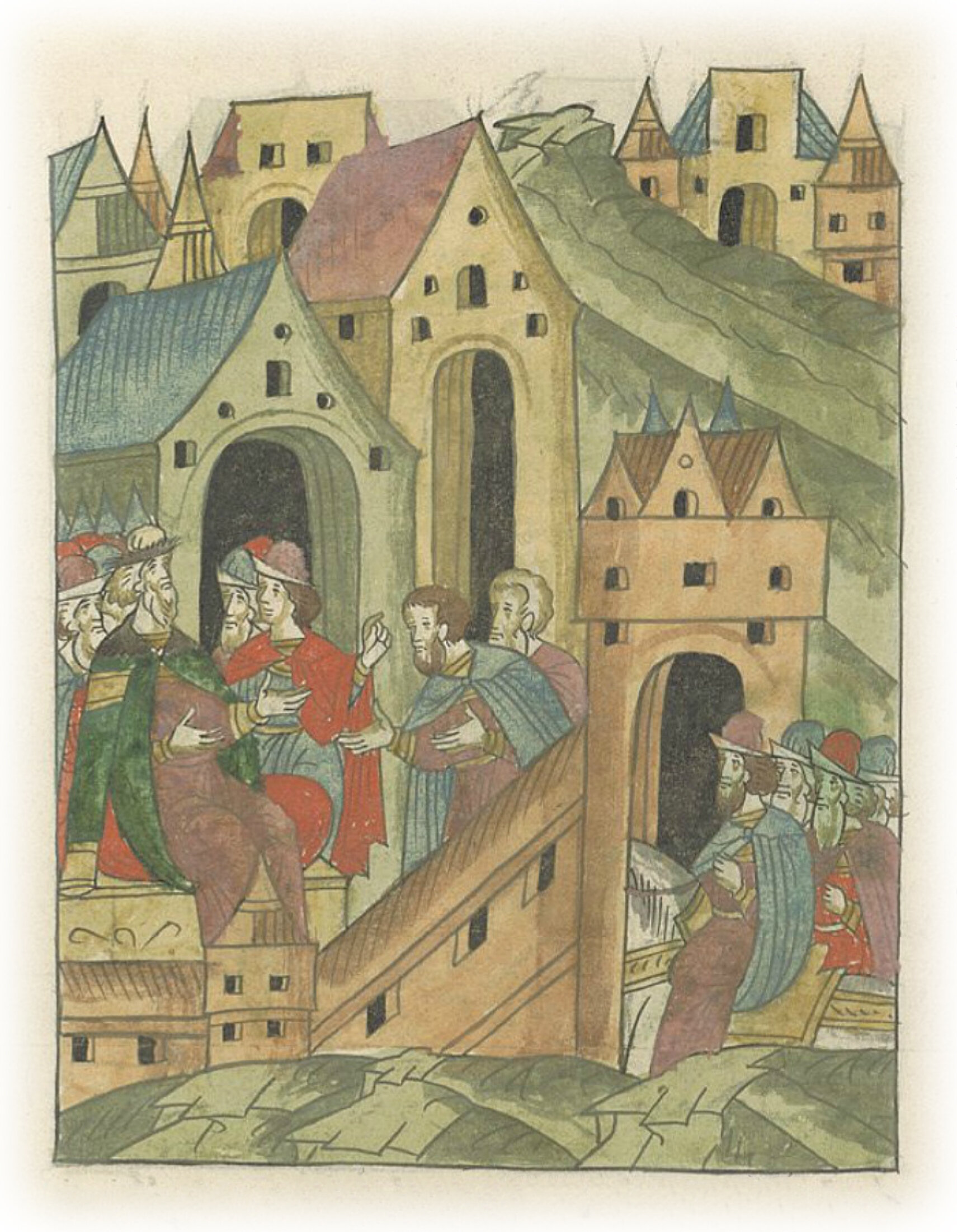 Ругодивские посадники Яким и Захар приезжают в Москву. Воеводы царя Ивана Васильевича Алексей Адашев и Иван Михайлов сообщают им, что государь пожалует их, если сдадут его воеводам помимо Ругодива Вышгород.