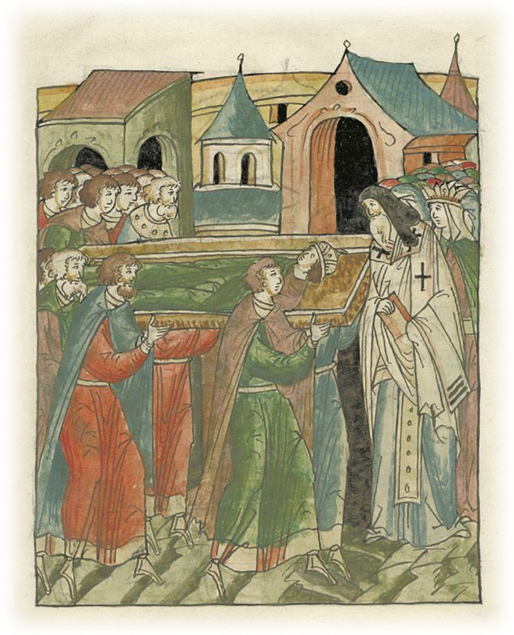 Ростовчане плачут над принесенным в город телом своего князя Василька Константиновича, убитого татарами.