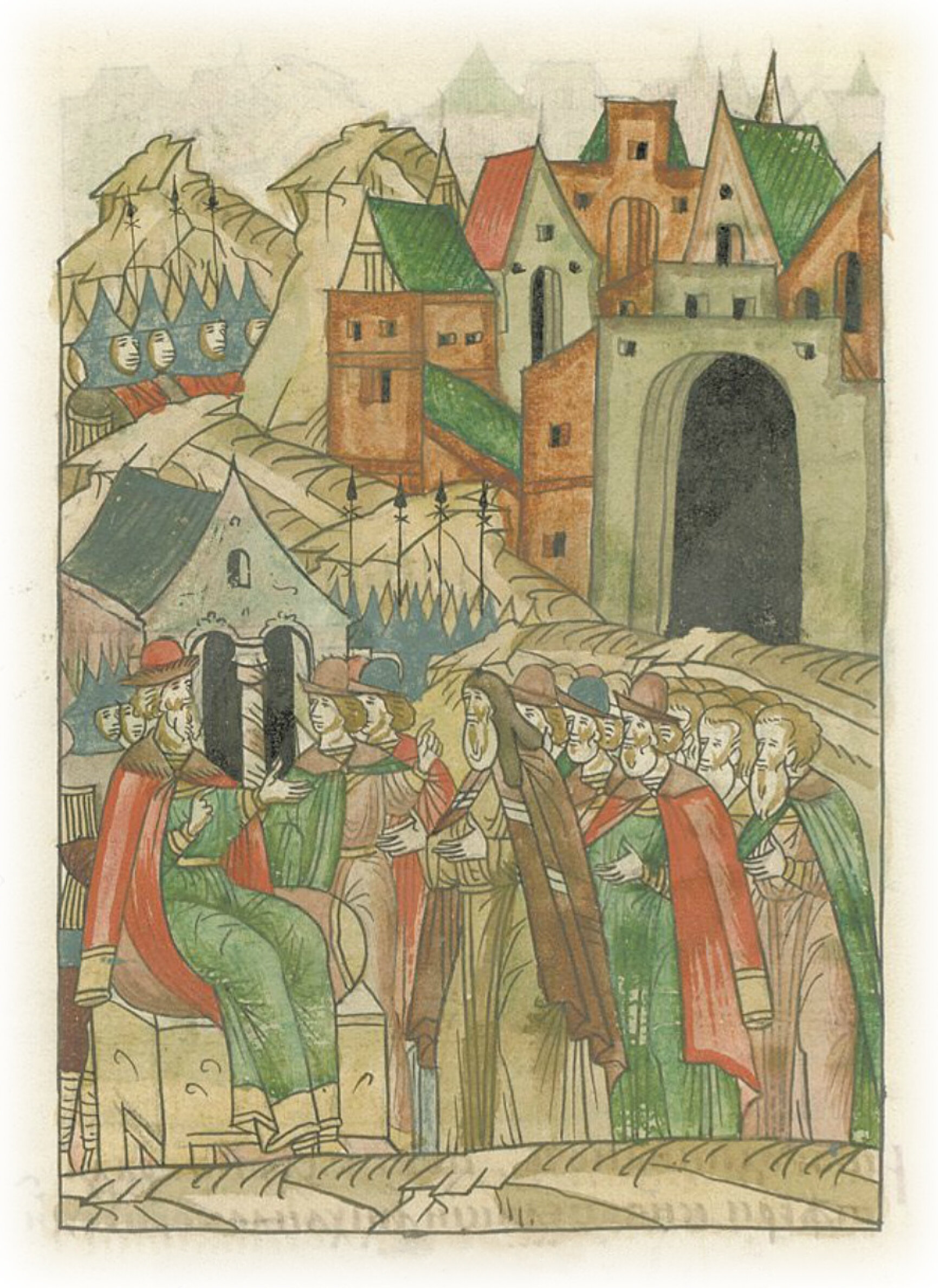 Взятие великим князем Иваном Васильевичем Твери. Тверской владыка Вассиан, князь Михаил Холмский с братьями и сыном, другие князья, бояре и земские люди отворяют город перед великим князем Иваном Васильевичем.