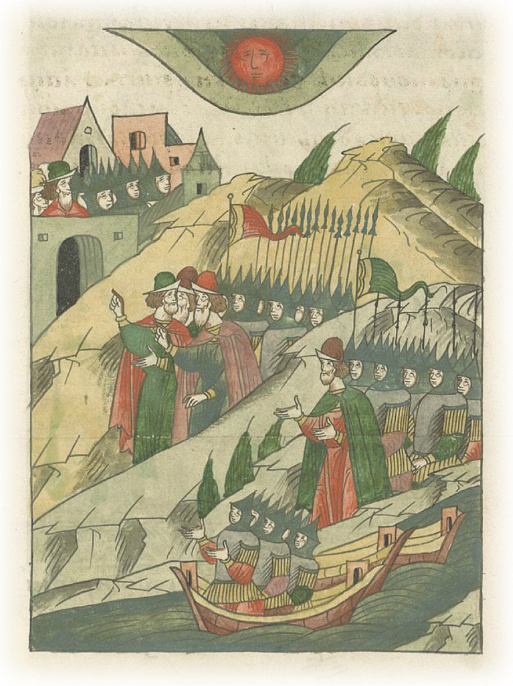 и вышли из судов на пригородное поле с небрежением, быстро и не осмотревшись, и пошли к городу пешими; а был тогда день очень жаркий.