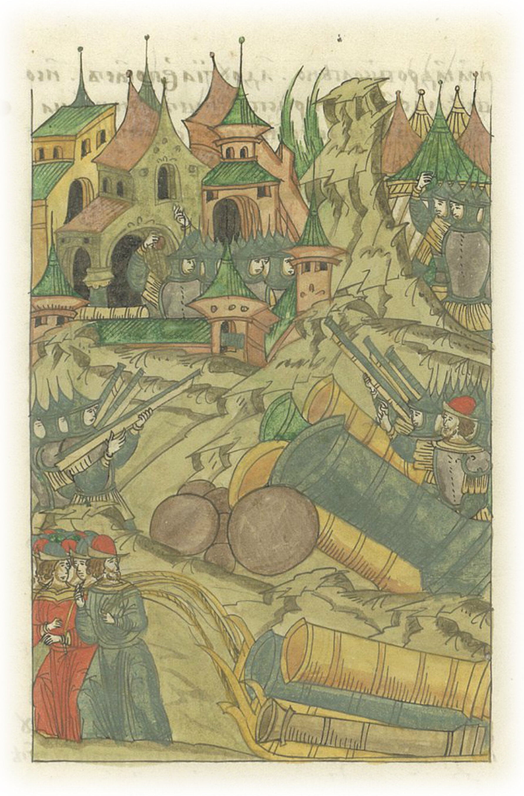 В тридцатый же день после первого приступа еще прикатили пушки, пищали и иные стенобитные сосуды многие, были у них еще пушки две великие, которые тут же отлили, у одной ядро – в колено, а у другой – в пояс; и со всеми силами приступив, начали бить по городу непрестанно со всех сторон.