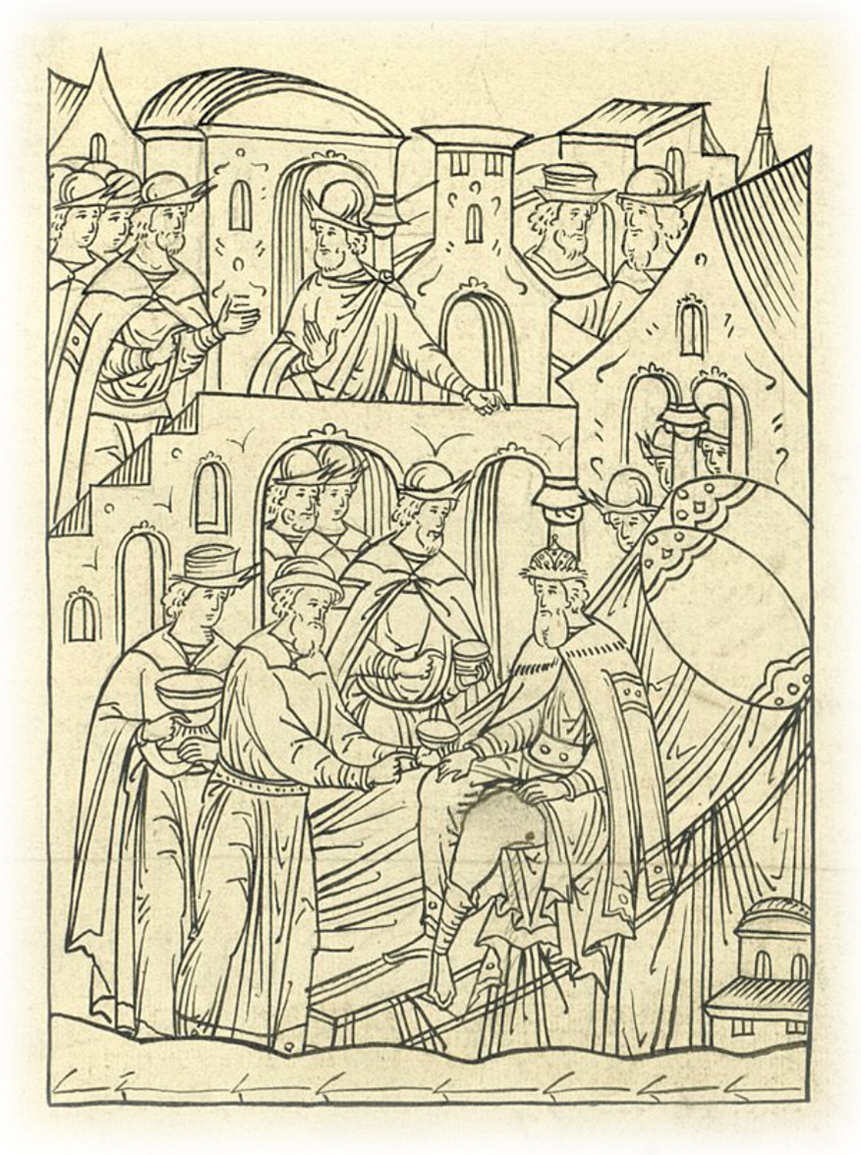 Великий князь Василий Иванович призывает нязя Михаила Львовича Глинского и докторов своих Николая Люева и Феофила, которые пытаются лечить его.