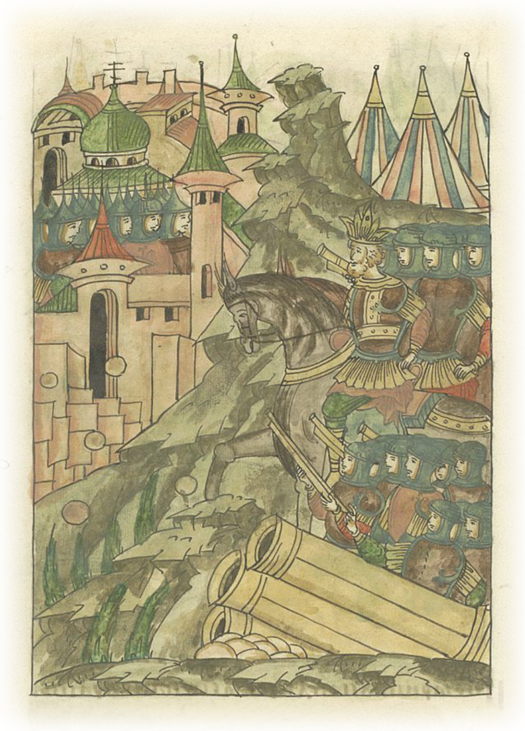 И придя, безбожный стал против разрушенного места и повелел вначале бить из пушек и из пищалей, чтобы отступили горожане.