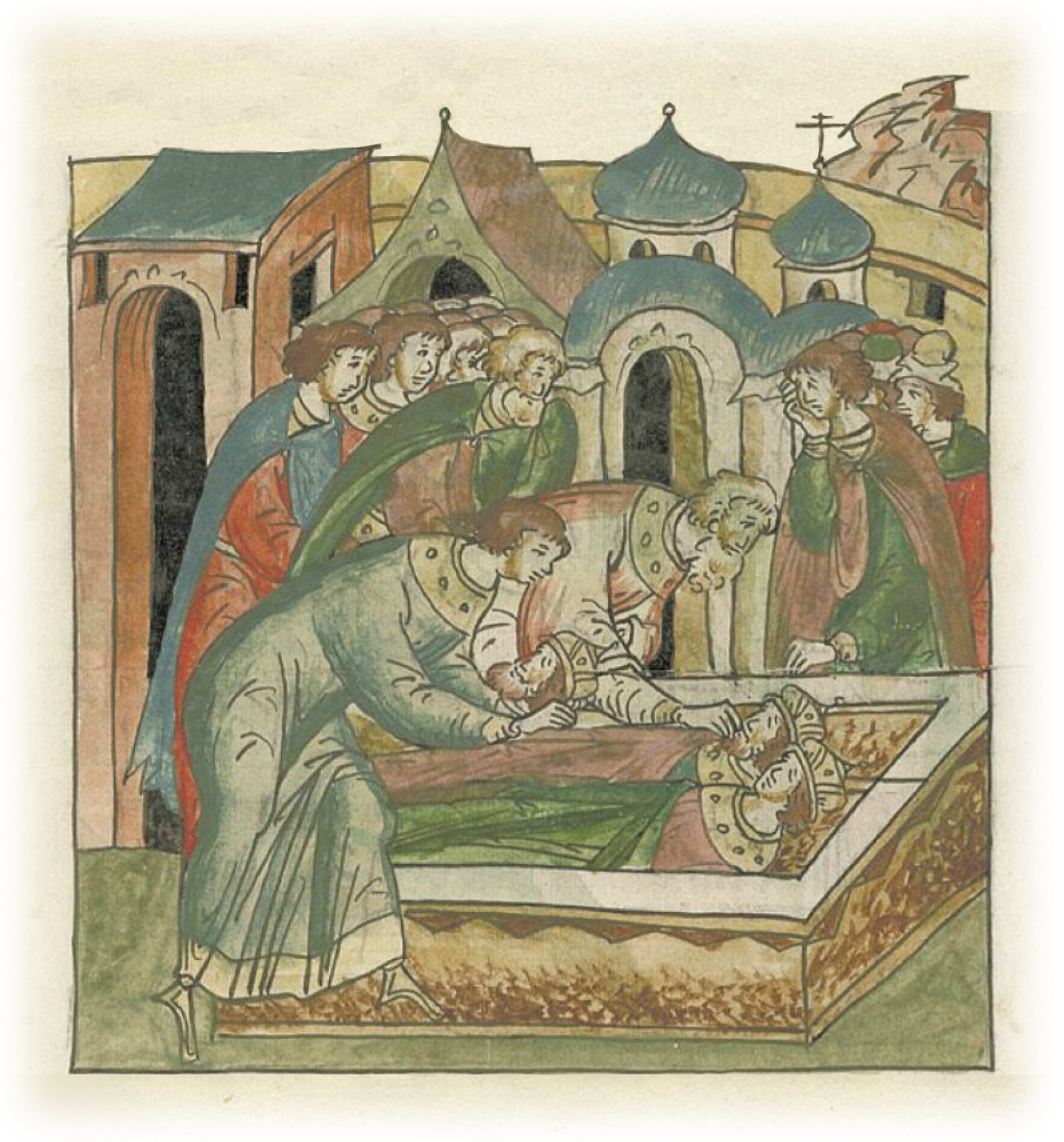 Найденную голову князя Юрия Всеволодовича вкладывают в гроб к его телу.