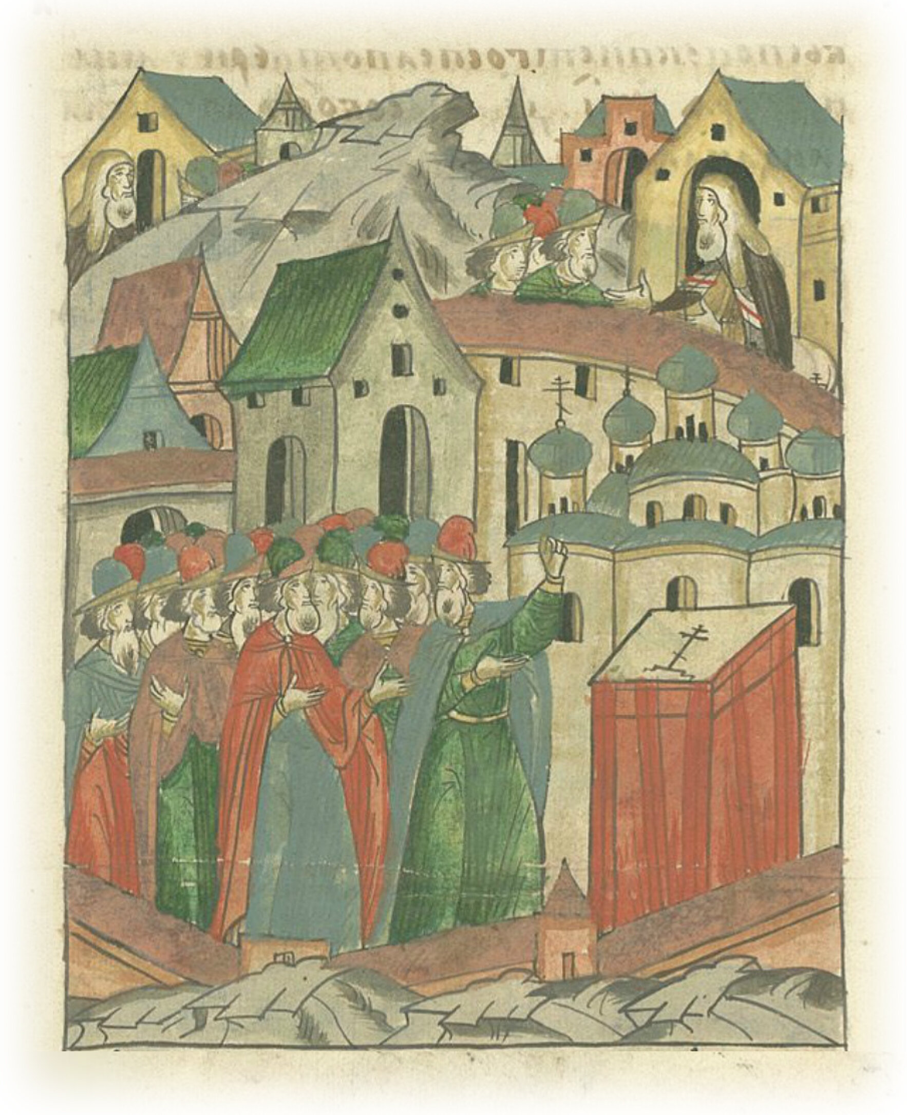 Той же зимой посадники новгородские сотворили вече по старому обычаю новогородскому, посадник Феодор Тимофеевич и тысяцкий Богдан Аввакумович, и крестным целованием укрепились – чтобы не звали их на Москву к митрополиту на суд, но судить бы их владыке Новгородскому Алексию, или кто после него иной владыка будет в Новгороде; судить же их по закону греческому, и в правде, и в вине быть у них по вере, по Евангелию закона греческого. А посаднику и тысяцкому судить своими судами по русскому обычаю, по целованию крестному; а на суд брать двум истцам по два боярина и по двое житейских людей* с каждой стороны. * люди, несущие службу при дворе князя или в уездных городах, боярские дети.