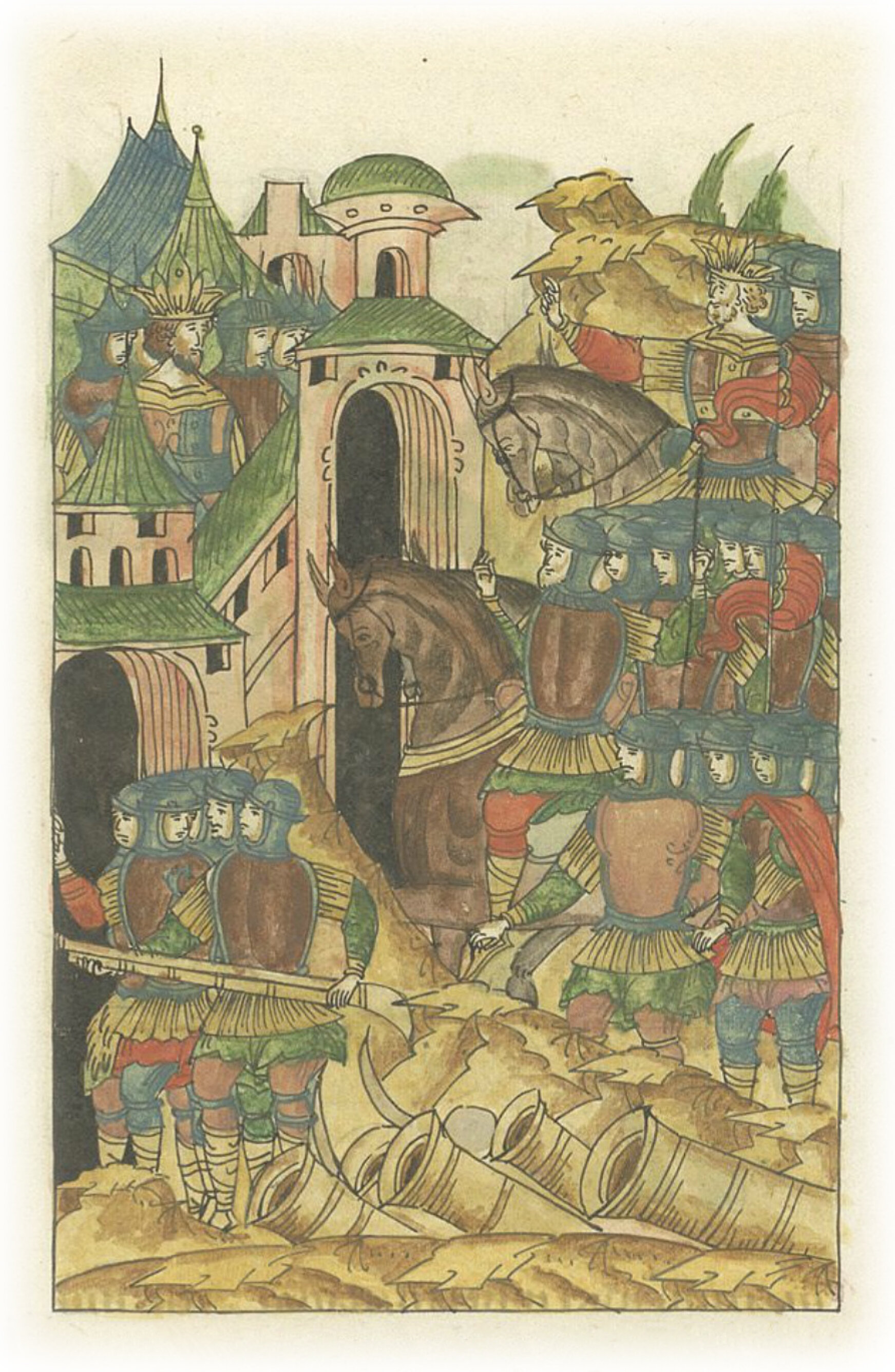 Языки говорят воеводам царя Ивана Васильевича, что магистр окопался большим рвом вокруг города Рындола, бьет из пушек и пищалей и приступает к Рындолу.