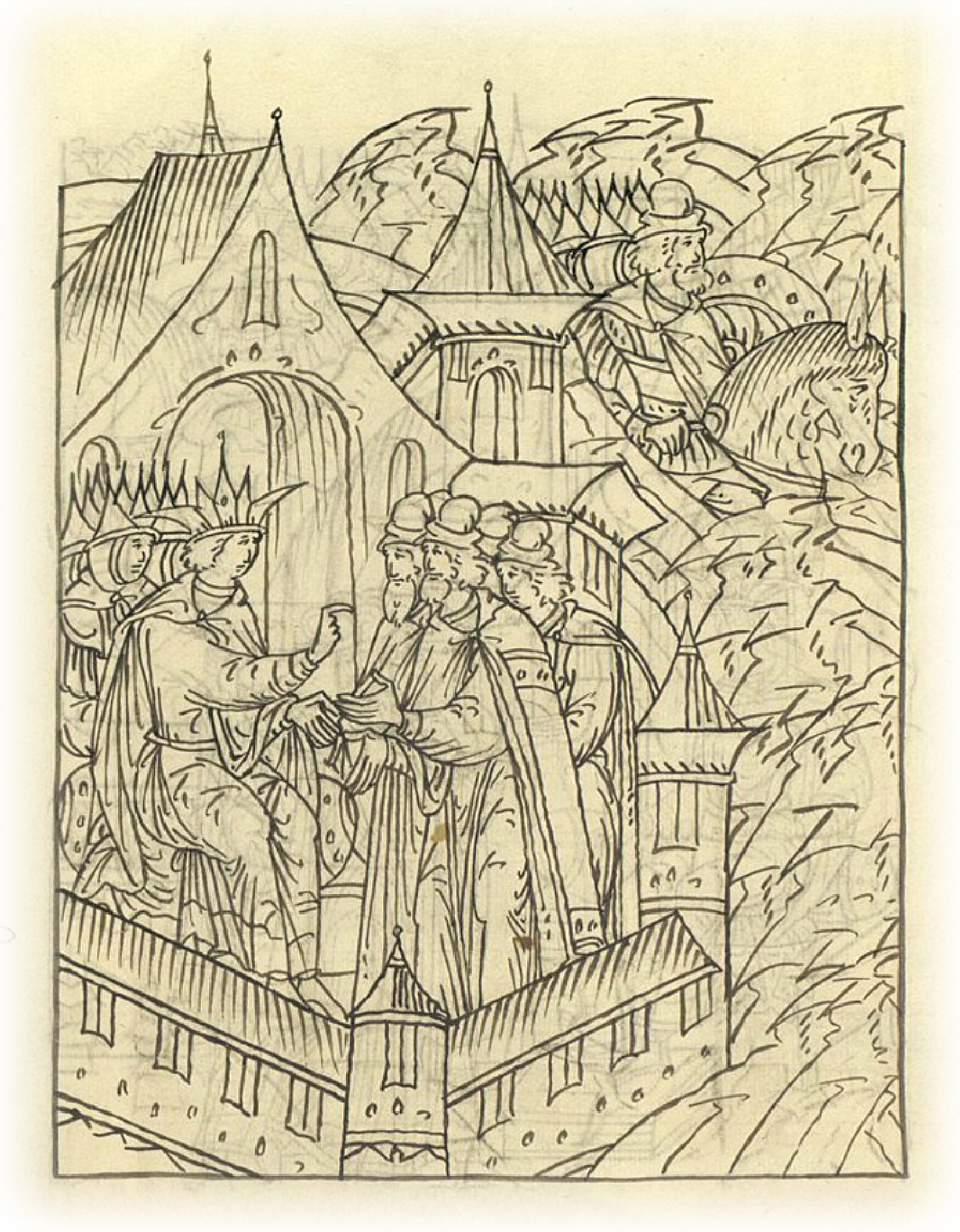 Ругодивские посадники Яким и Захар приезжают в Москву. Воеводы царя Ивана Васильевича Алексей Адашев и Иван Михайлов сообщают им, что государь пожалует их, если сдадут его воеводам помимо Ругодива Вышгород.