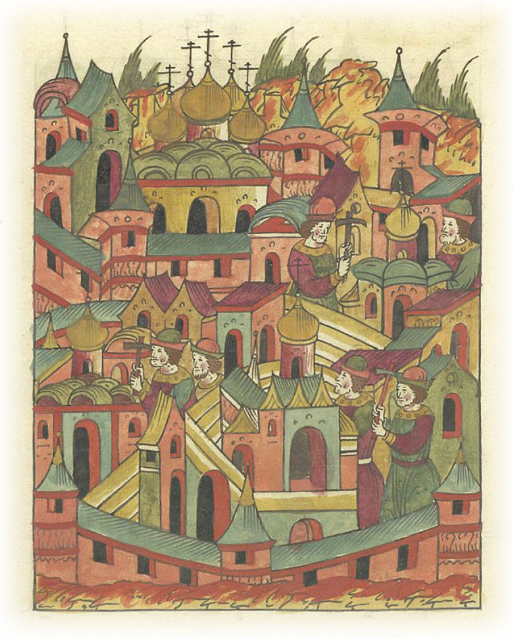 В то же лето церкви каменные сделаны в Новом городе: на Иосифовском подворье храм Благовещения пресвятой Богородицы, храм святых Жен Мироносиц в Новом городе у Устюжского двора, храм живоначальной Троицы у Старых полей.