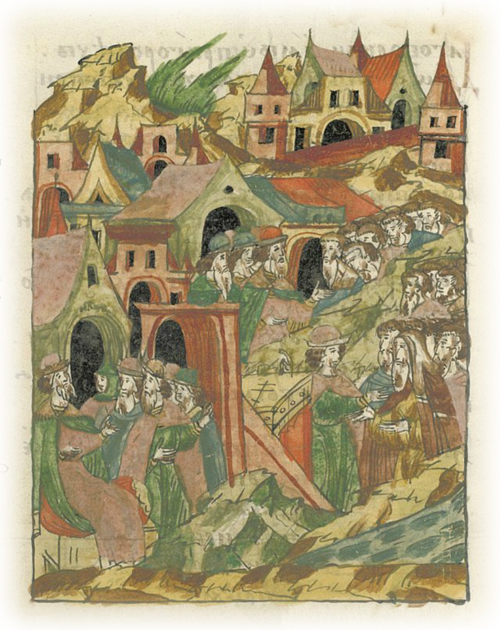 И как целовали крест, бояре новгородские и зажиточные горожане, и купцы, и архиепископ с ними со всеми бил челом боярам, чтобы ходатайствовали государю: «Перестал бы на них гневаться и с сердца сложил, и слово свое из уст своих сказал вслух всем по прежнему своему слову и жалованию; а отчина их Великий Новгород к своим государям крест целовали здесь у Троицы по записи, а в городе весь Великий Новгород, отчина их, по той же записи крест целуют». И бояре князю великому то сказали,