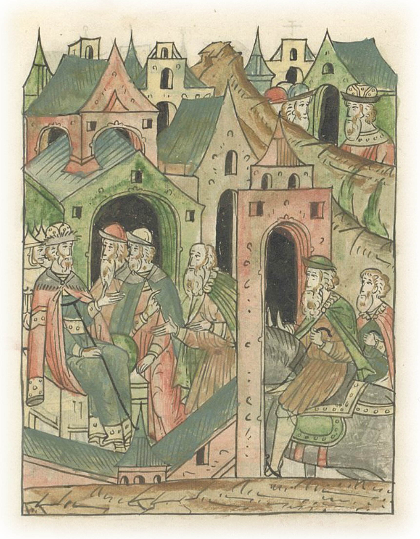 Ругодивские посадники Яким и Захар приезжают в Москву. Воеводы царя Ивана Васильевича Алексей Адашев и Иван Михайлов сообщают им, что государь пожалует их, если сдадут его воеводам помимо Ругодива Вышгород.