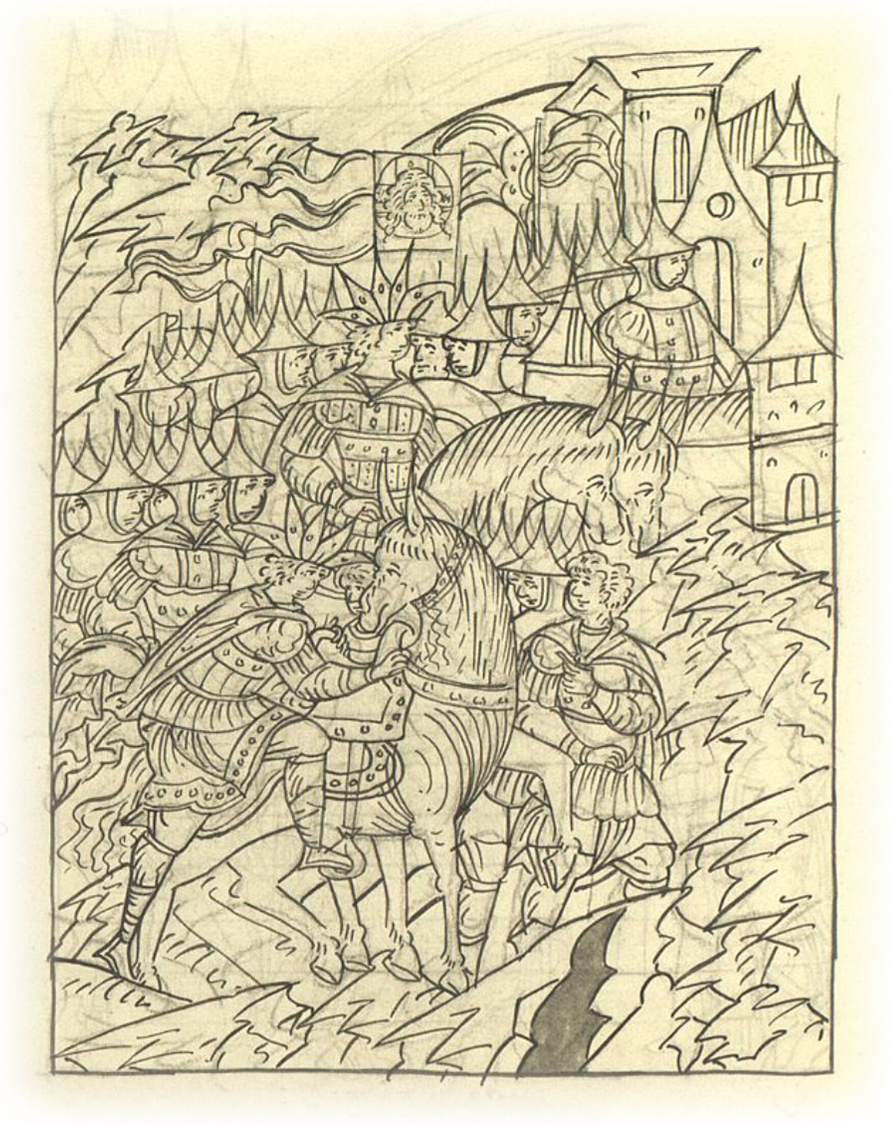 И вступает государь в бранное стремя, садится на коня и поскору пошел к полку своему, к городу. И видит государь: знамена христианские уже на стенах городских.