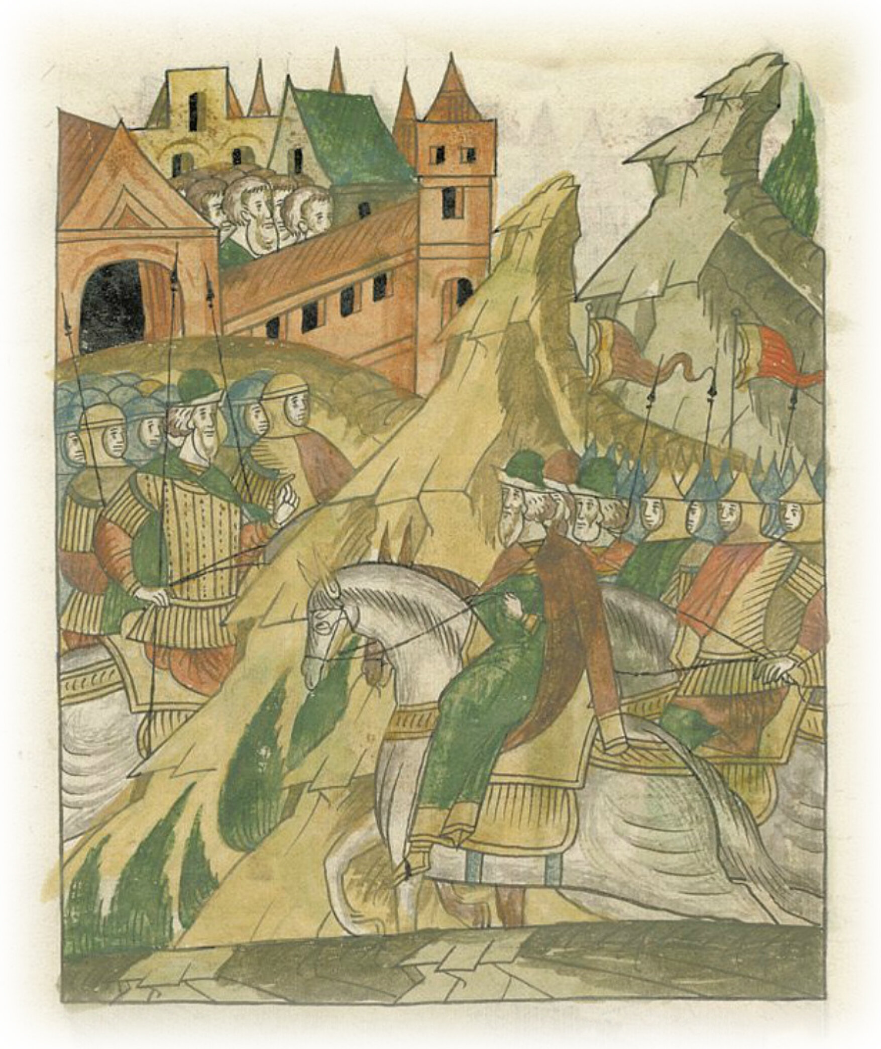 Пан Юрий Глебович, смоленские князья, бояре и гетманы с солдатами выходят за город против воевод великого князя.