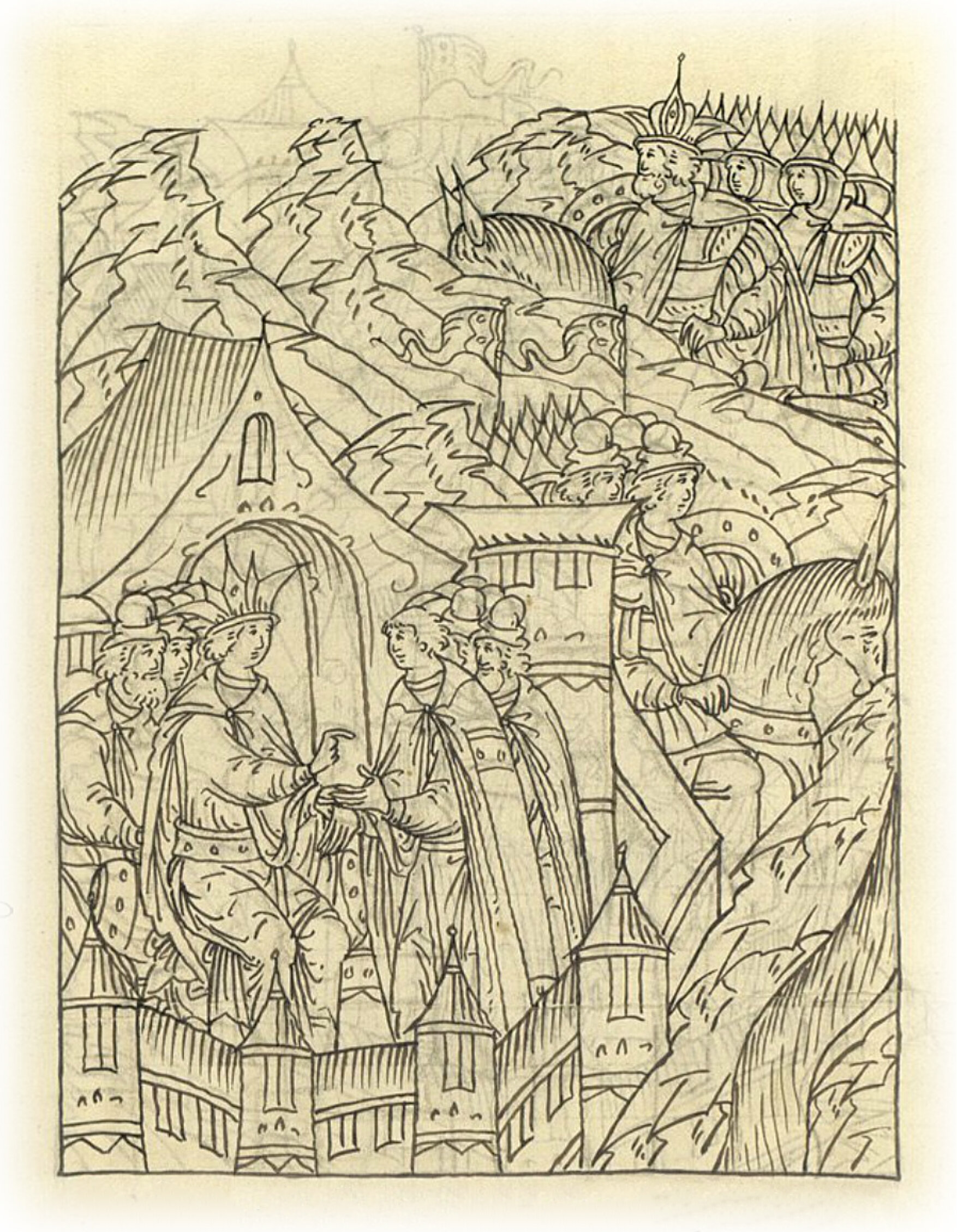 Языки говорят воеводам царя Ивана Васильевича, что магистр окопался большим рвом вокруг города Рындола, бьет из пушек и пищалей и приступает к Рындолу.