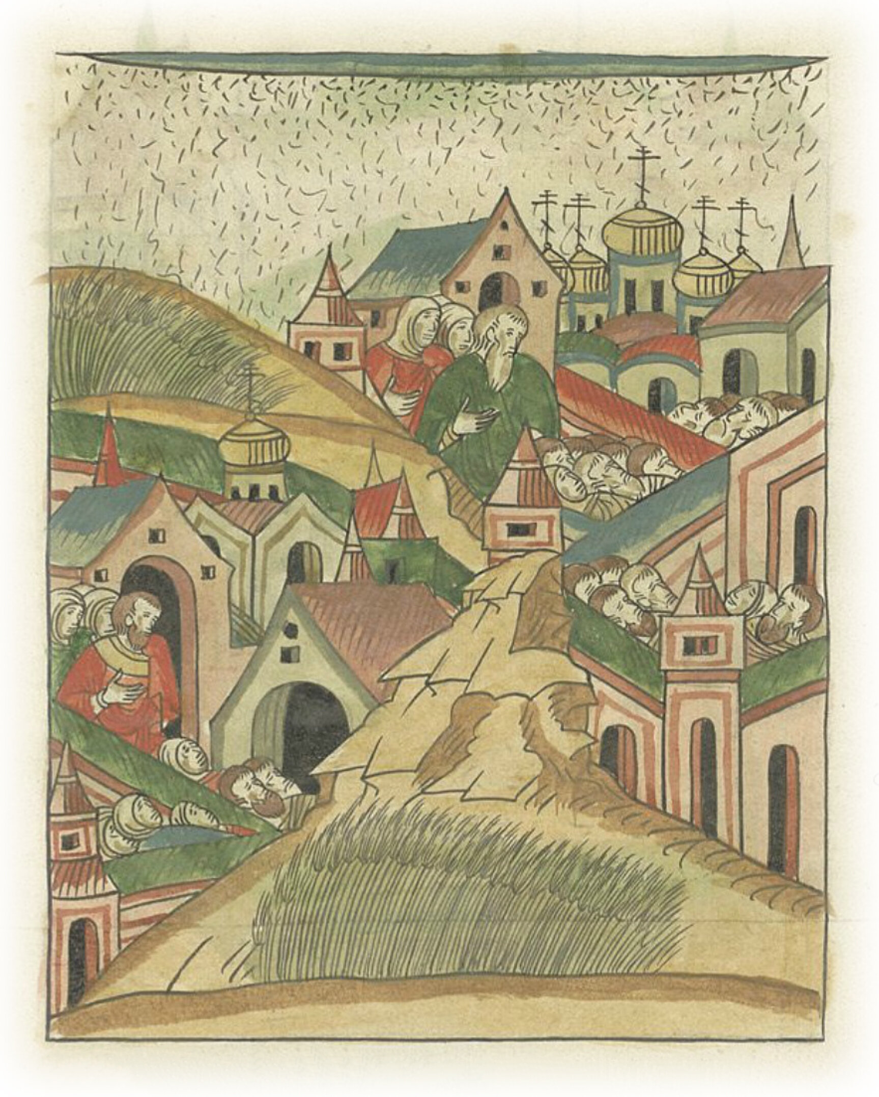 Был мор в Пскове и в Новгороде великий с Пасхи, а начал униматься с Филипова поста. В то же лето 14 мая снег лег высотой в пядь и лежал два дня; того же месяца 26 - снег лежал день; и августа месяца 18 был мороз, и другой мороз был в том же месяце 27 и яровые посевы побил.