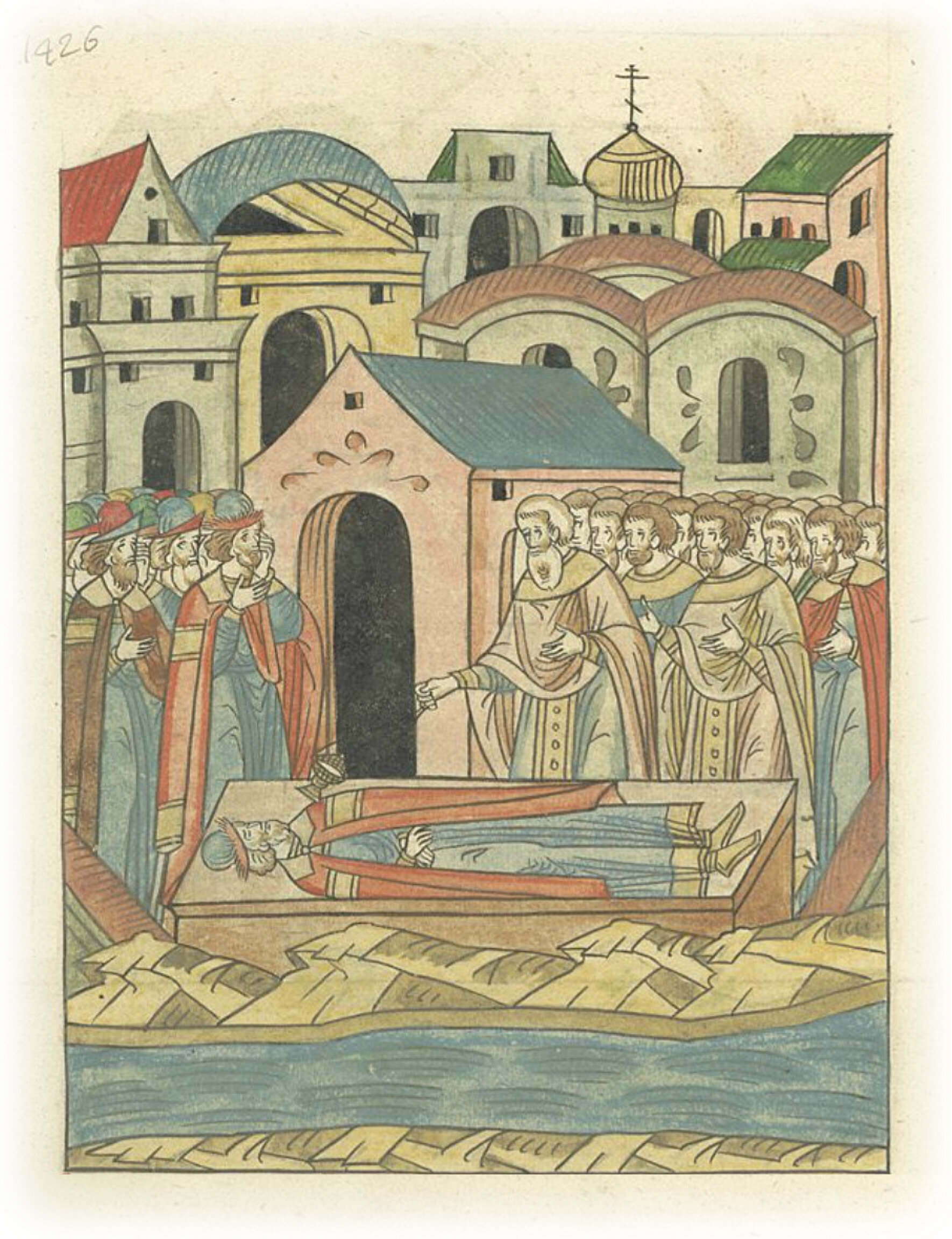 Князь Василий Дмитриевич плачет над телом своего брата князя Ивана Дмитриевича, утонувшего в реке Пьяне во время битвы с татарами. Похороны князя Ивана Дмитриевиа в церкви святого Спаса.