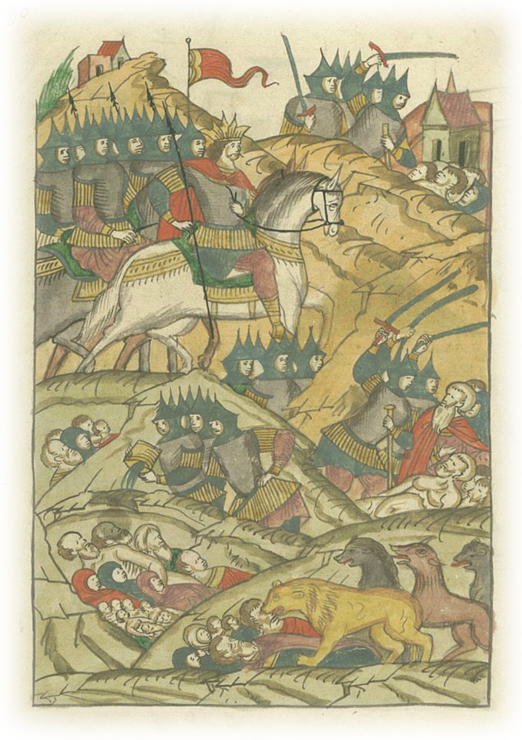 прошел по всему востоку и тамошних жителей, не покоряющихся ему, повелел с женами и детьми засыпать в рвы, отдавать зверям (на растерзание) и предавать различным казням.