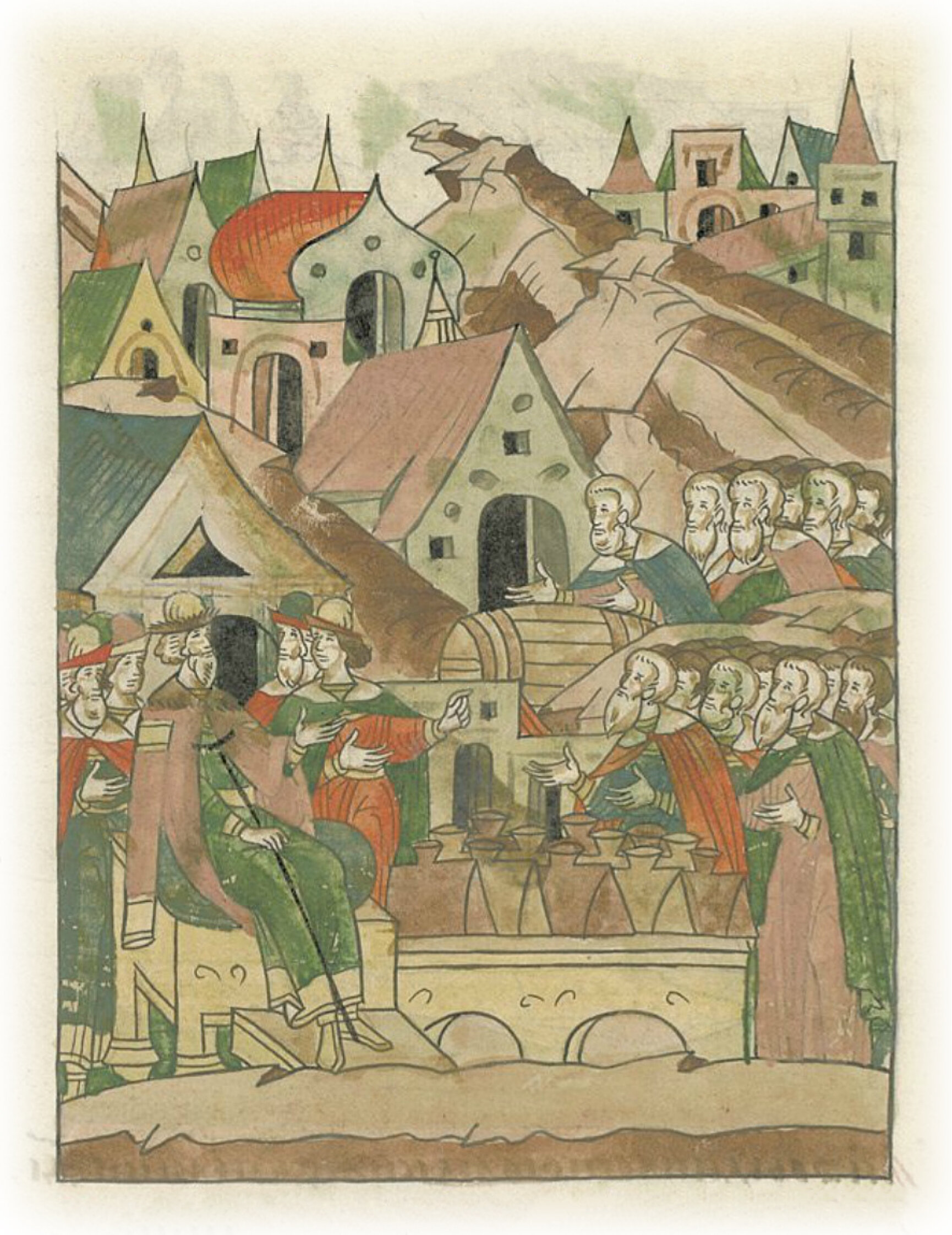Новгородские посадники встречают великого князя Ивана Васильевича в Плашкине.