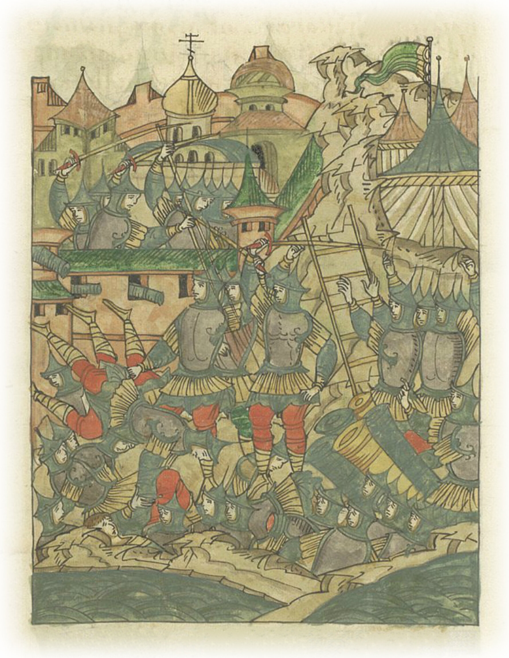 И как говорится: «Какой язык может поведать или рассказать те беды и страсти!?» Падали трупы с обеих сторон как снопы с забрал, и кровь их текла, как реки; и наполнились рвы трупами человеческими доверху, так что турки ходили по ним, как по ступеням, и бились; ибо мертвые им были мостом и лестницей к городу; также и протоки, и берега вокруг города наполнились трупами, и лиман Галатский был кровав, так сильно и нещадно бились. И если бы Господь не закончил день тот, уже конечная была бы погибель городу, потому что горожане все уже изнемогли.