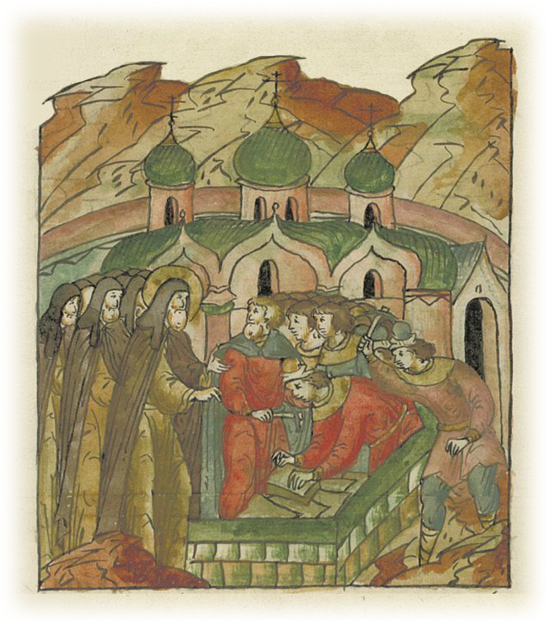 Чудотворец Варлаам закладывает каменную церковь Преображения Господа Бога Спаса нашего Исуса Христа на Хутыни.