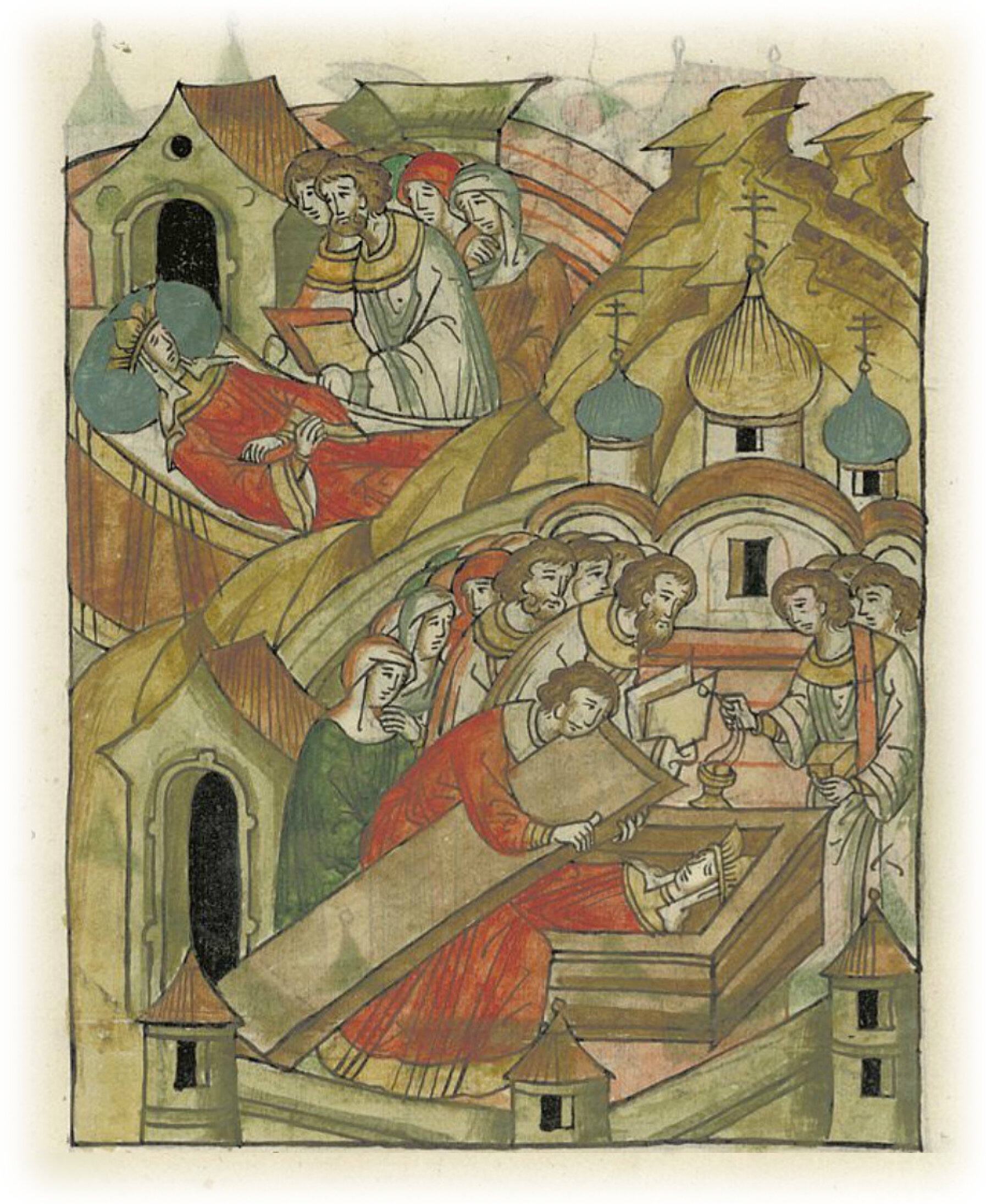Кончина княгини Февронии, супруги князя Михаила, и ее похороны в церкви Пречистой Богородицы в Суздале.