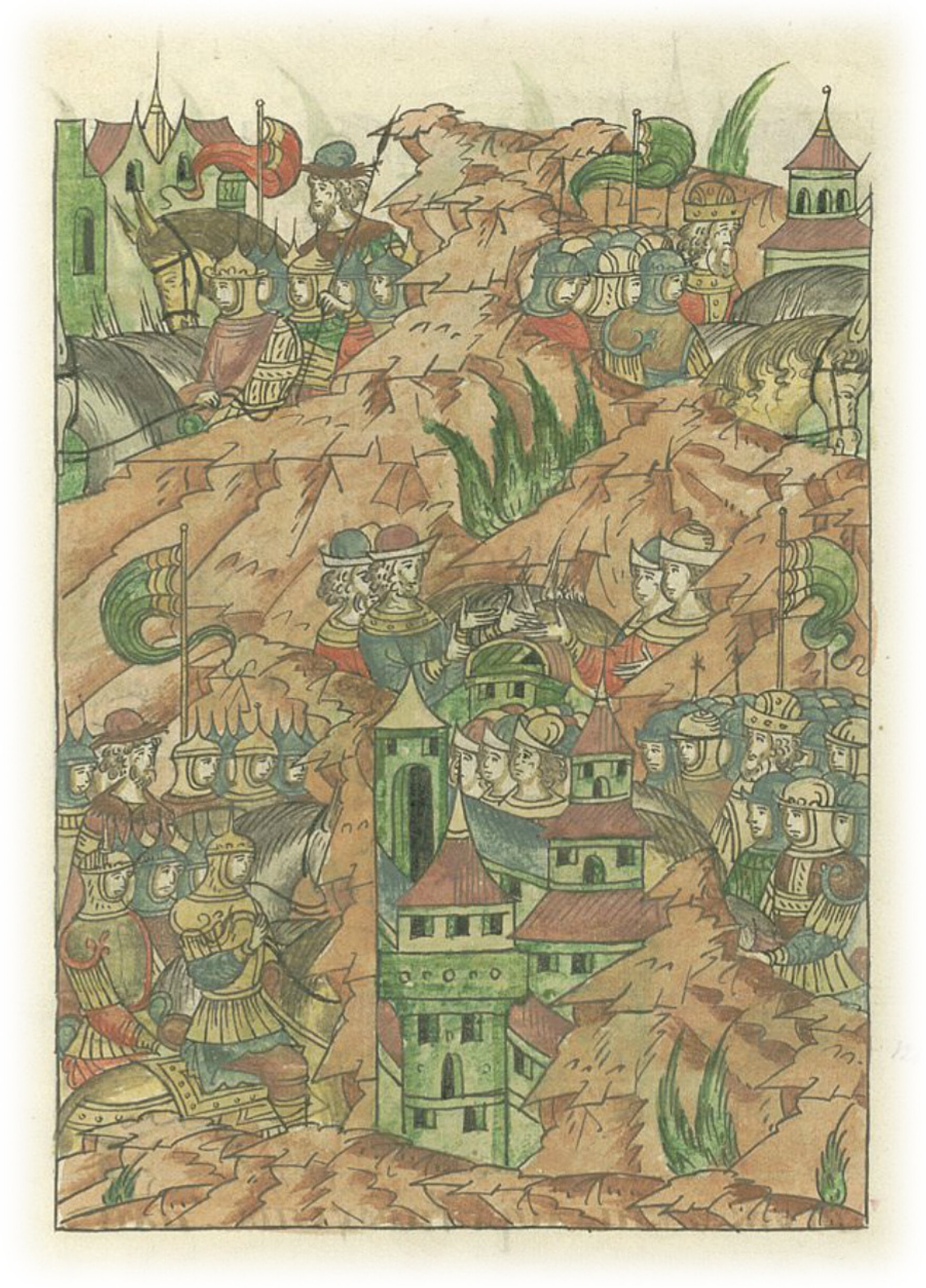 Языки говорят воеводам царя Ивана Васильевича, что магистр окопался большим рвом вокруг города Рындола, бьет из пушек и пищалей и приступает к Рындолу.
