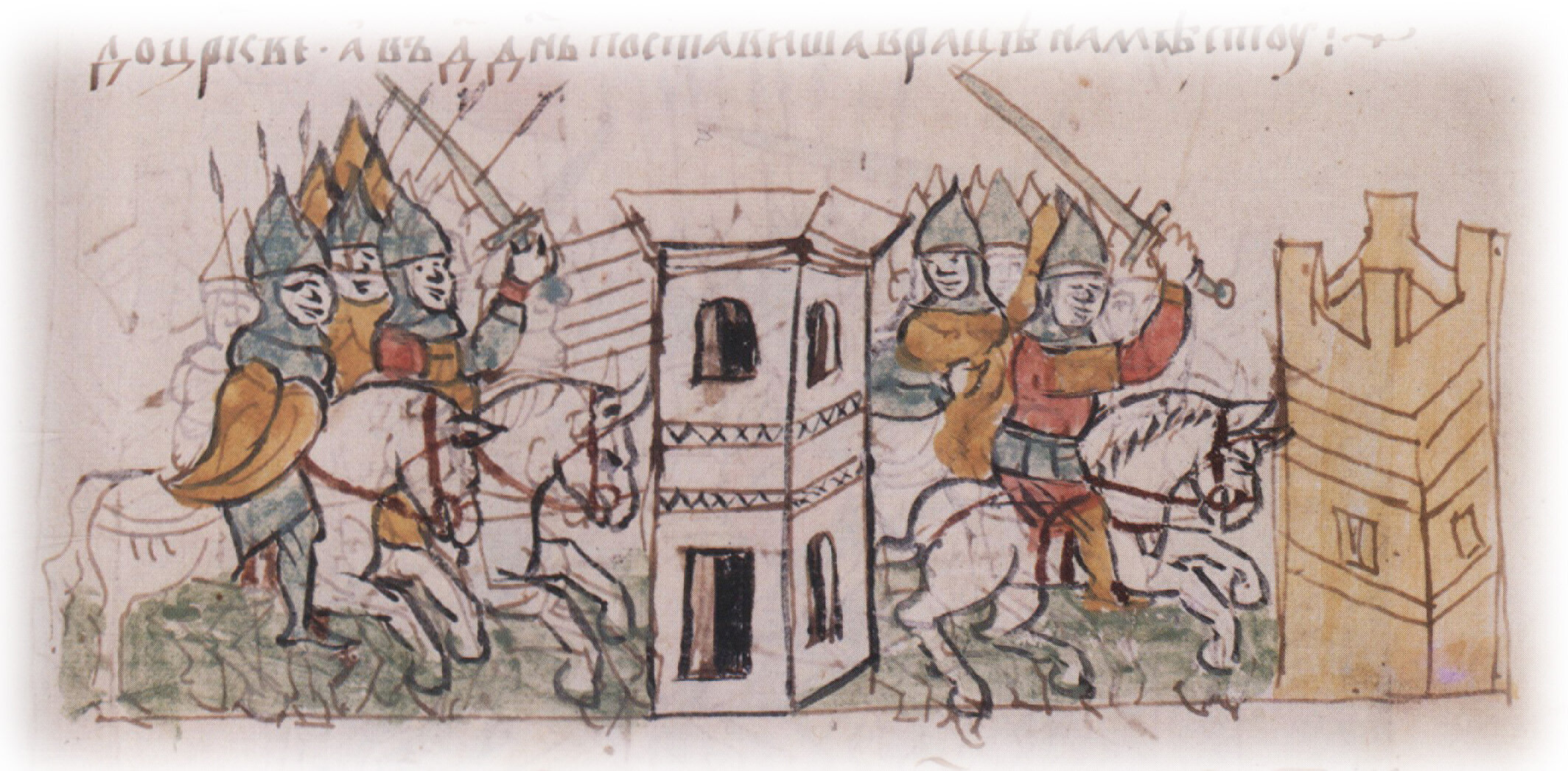 Рисунок "мастера Б" — перо. Правлен (фигуры, лица, шлемы, наконечники копий, щит, архитектура в центре, лошади) "мастера В" — кисть. Позднейшая пририсовка сбруи и стремян — перо.