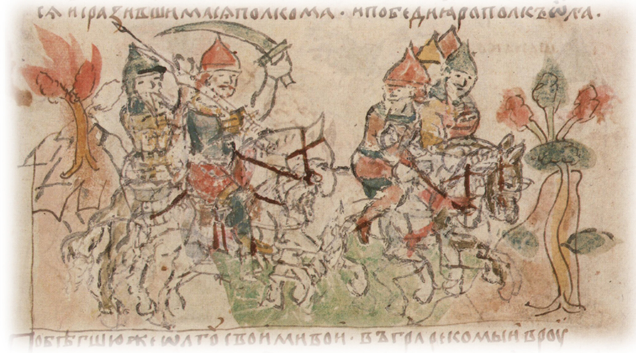 "В лето 6485. Поиде Ярополк на брата своего на Олга, на Деревеньскую землю... И изыде і противу ему Олег... и победи Ярополк Олга".