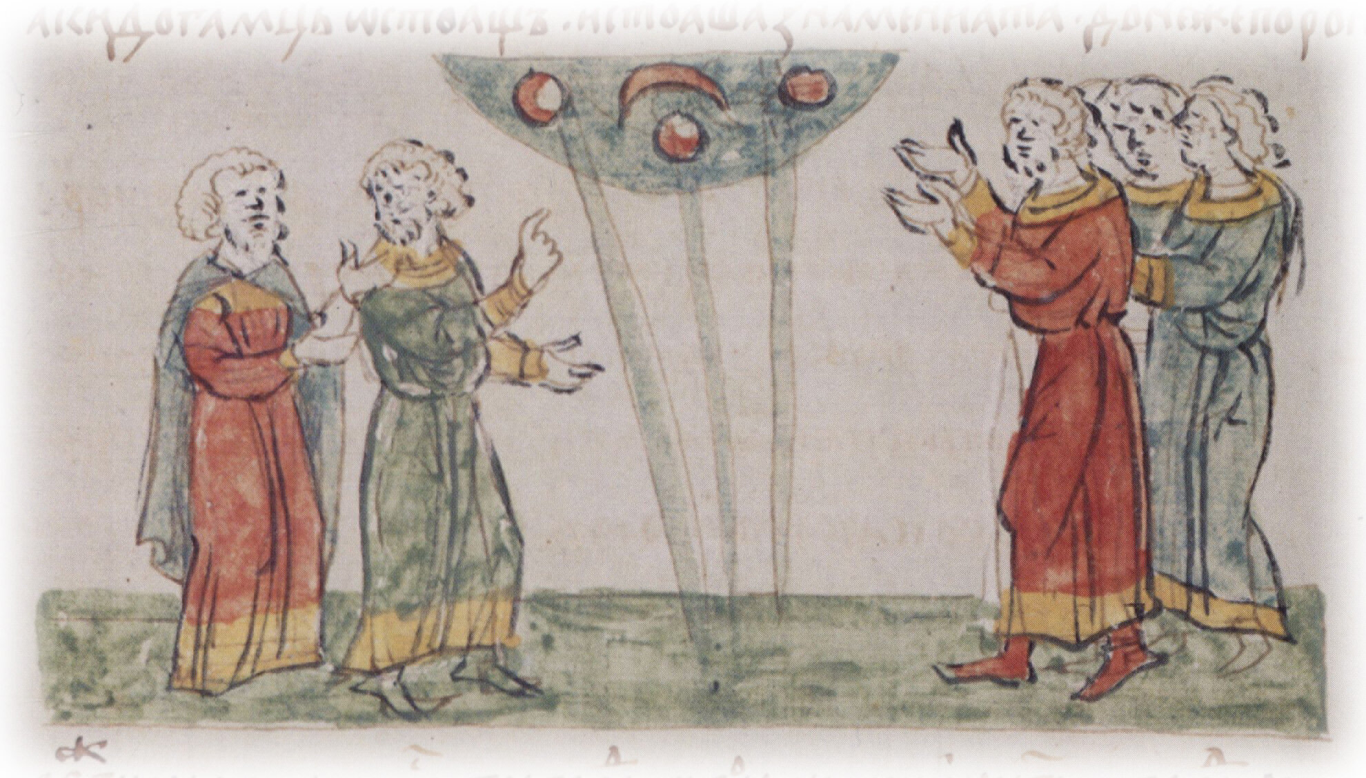 "...дивно знамение быть на небеси и страшно: быша 3 солнца, сияюще межи собою, а столпие трие от земли до небеси, над всеми горе бяше аки дуга месяць остоащ".