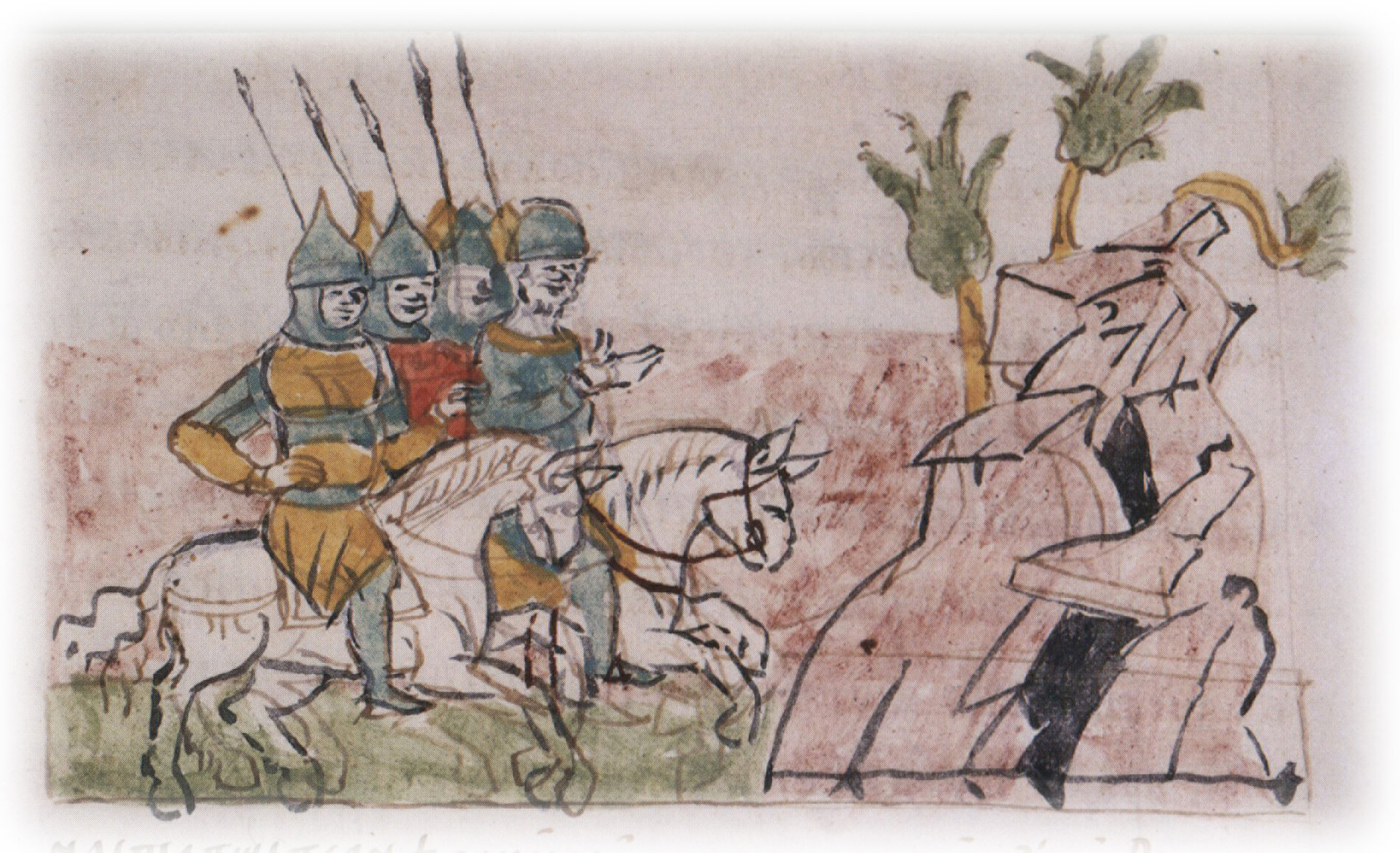 Рисунок "мастера Б" — перо. Правлен (фигуры, лица, шапка, шлемы, копья, лошади, холм) "мастера В" — кисть. Позднейшая пририсовка сбруи и стремени у лошади справа — перо.