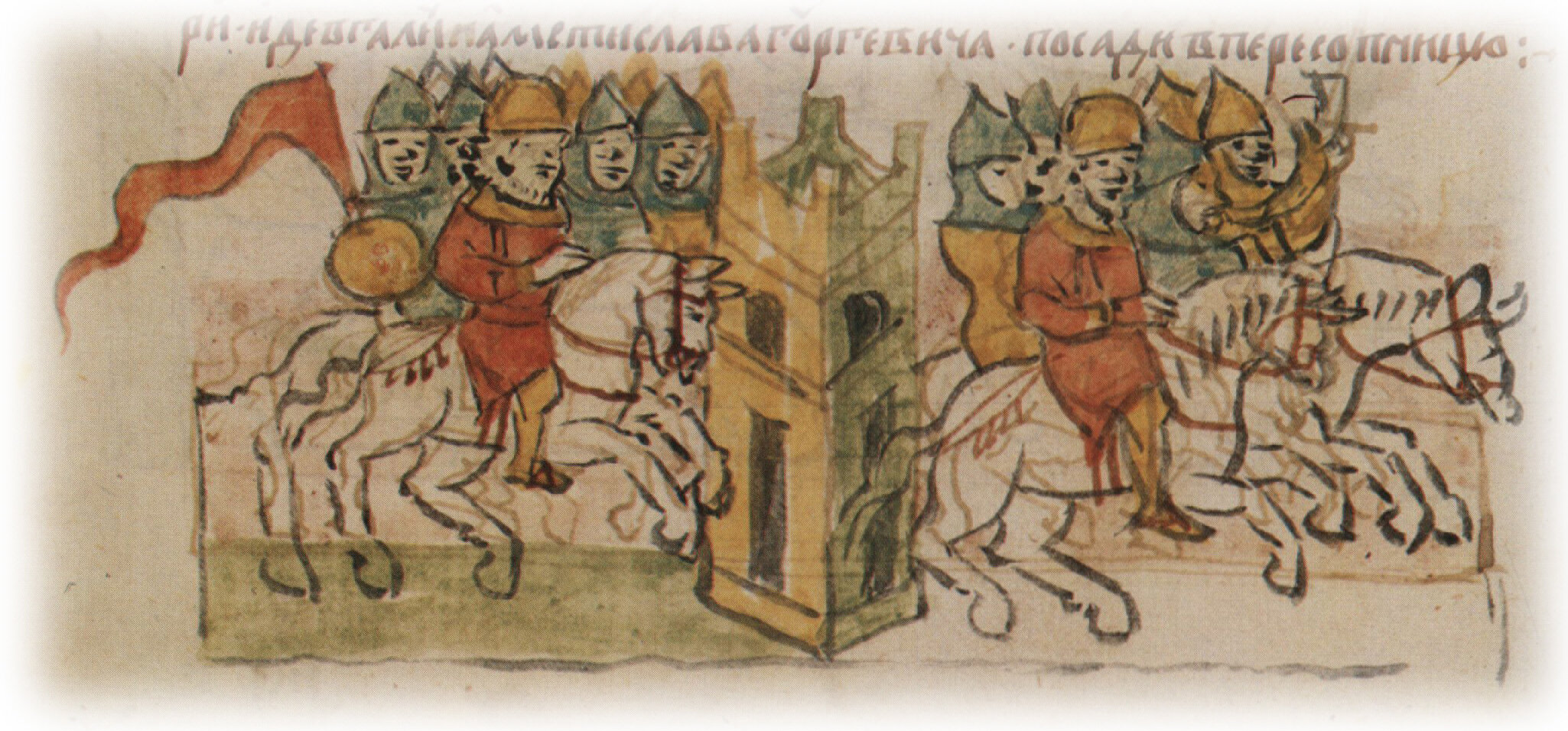 Рисунок "мастера Б" — перо. Правлен (фигуры, лица, шапки, шлемы, щит, архитектура, лошади) и дополнен (знамя, лошадь справа) "мастера В" — кисть. Позднейшая пририсовка сбруи и стремян — перо.