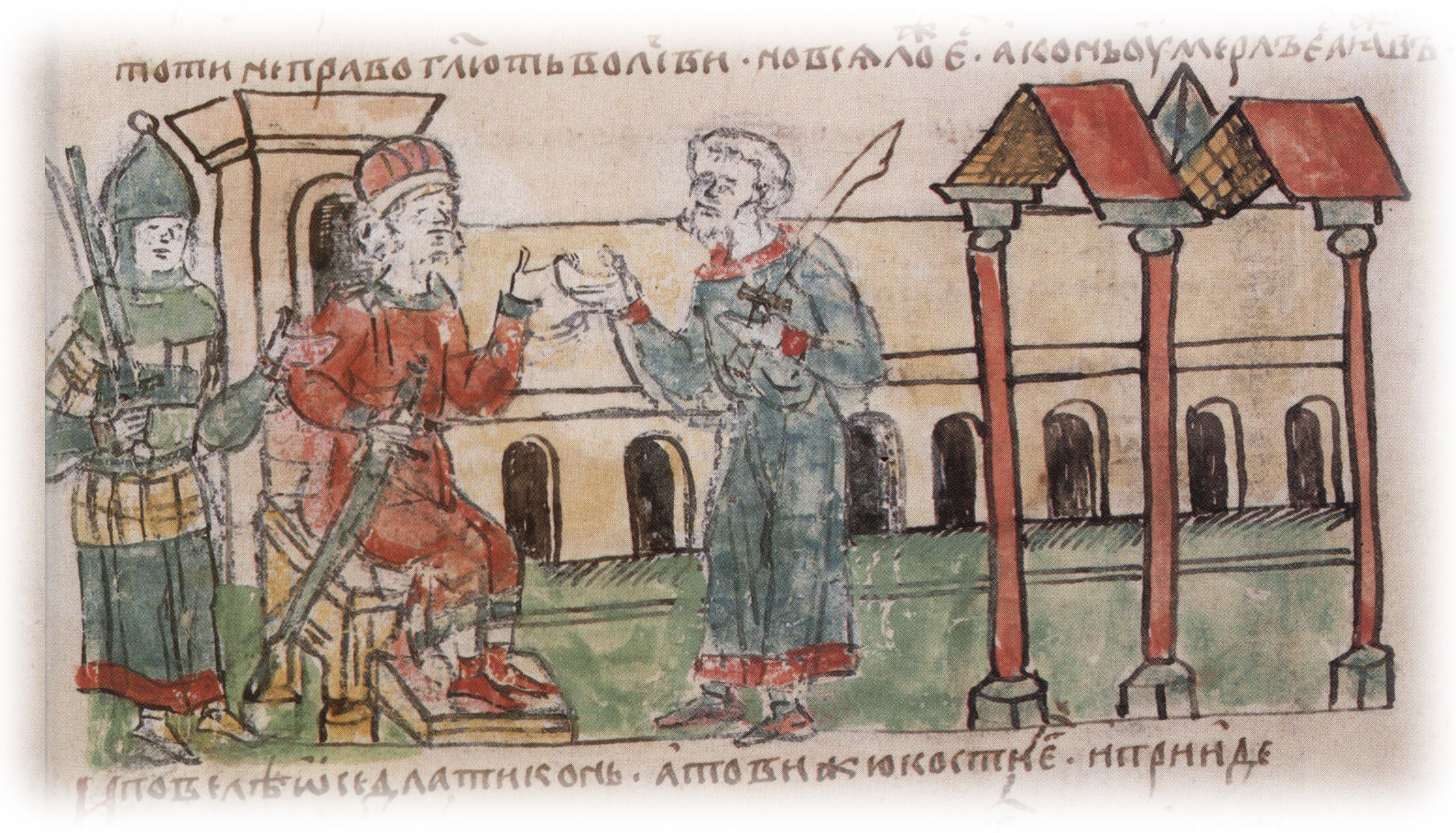 "И призва старейшину конюхом, рече: «Кое есть конь мъй, егоже бе поставил кормити и блюсти его?» Он же рече: «Умерл есть». Олег же посмеася и укори кудесника, река: «То ти неправо глаголют волъсви, но вся ложь есть: а конь умерл есть, а я жив»".