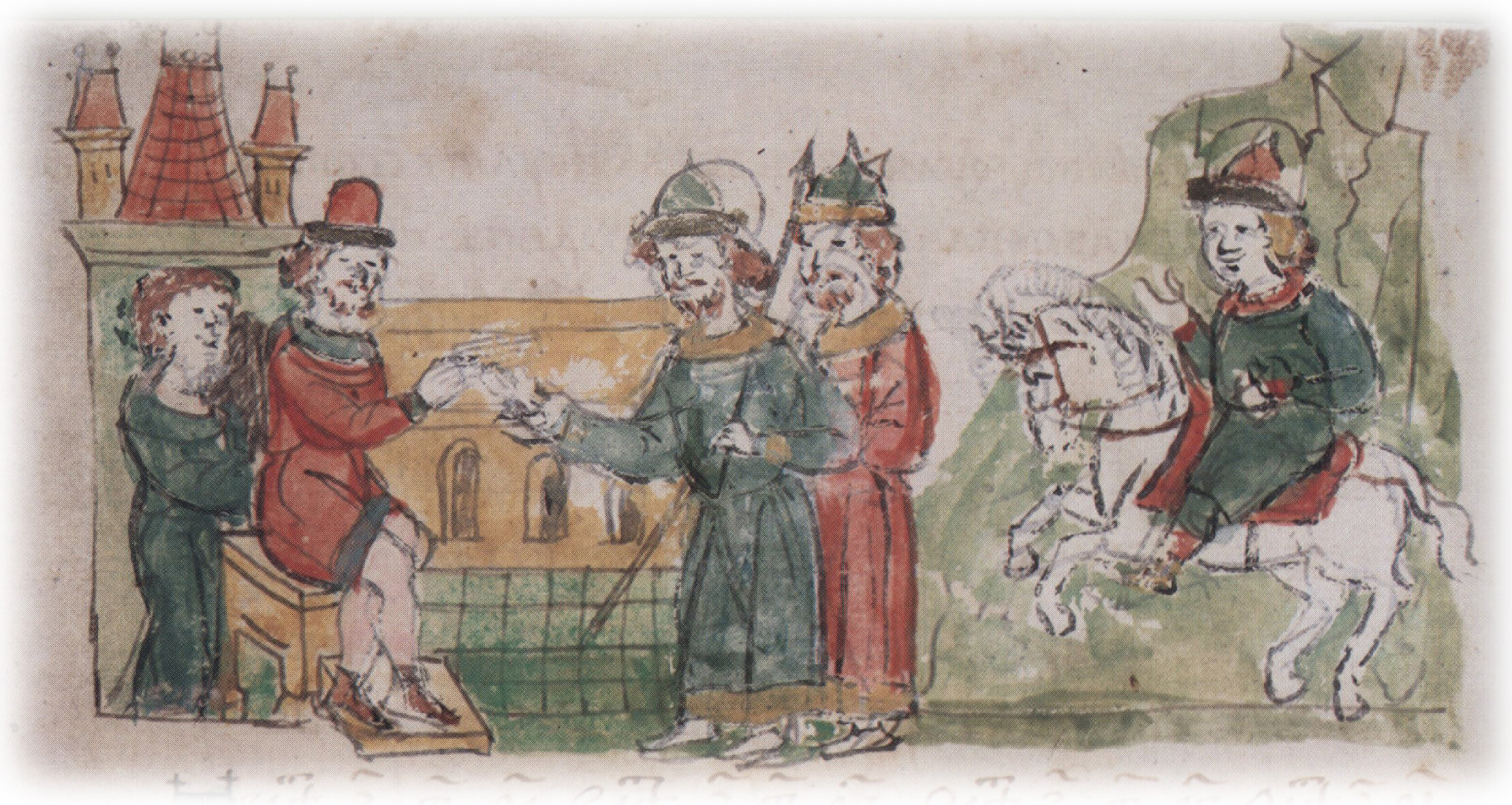 Левая половина рисунка по содержанию не ясна; правая половина — гонец с вестью о нападении русских на Царьград на пути к византийскому императору Михаилу, находившемуся в походе.
