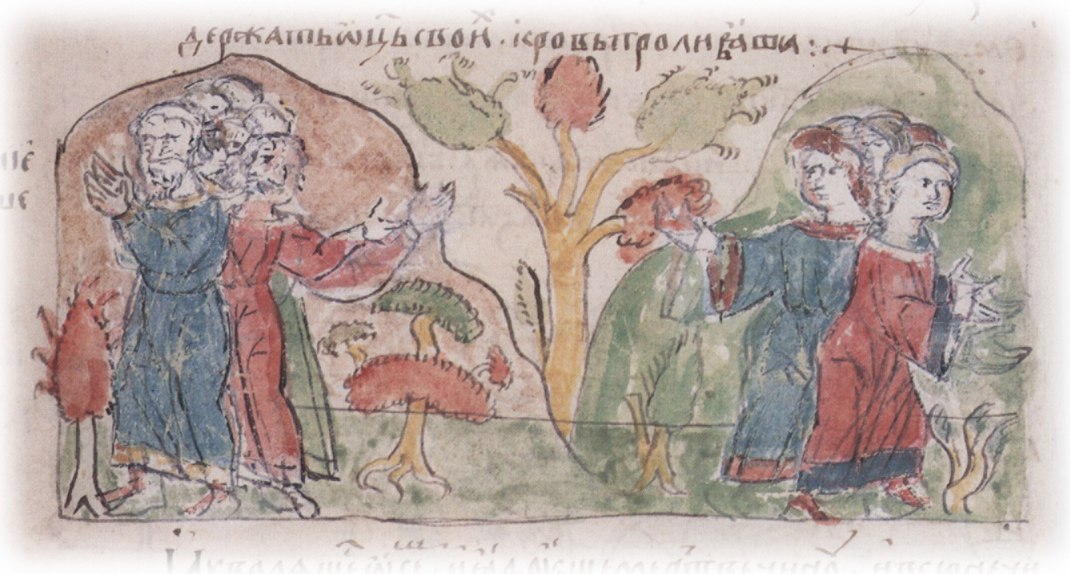 Тайное погребение Владимира Святославича, умершего в Берестове: спуск его тела на землю на ковре между разобранными клетьми здания; положение тела Владимира в мраморный гроб в церкви Святой Богородицы.