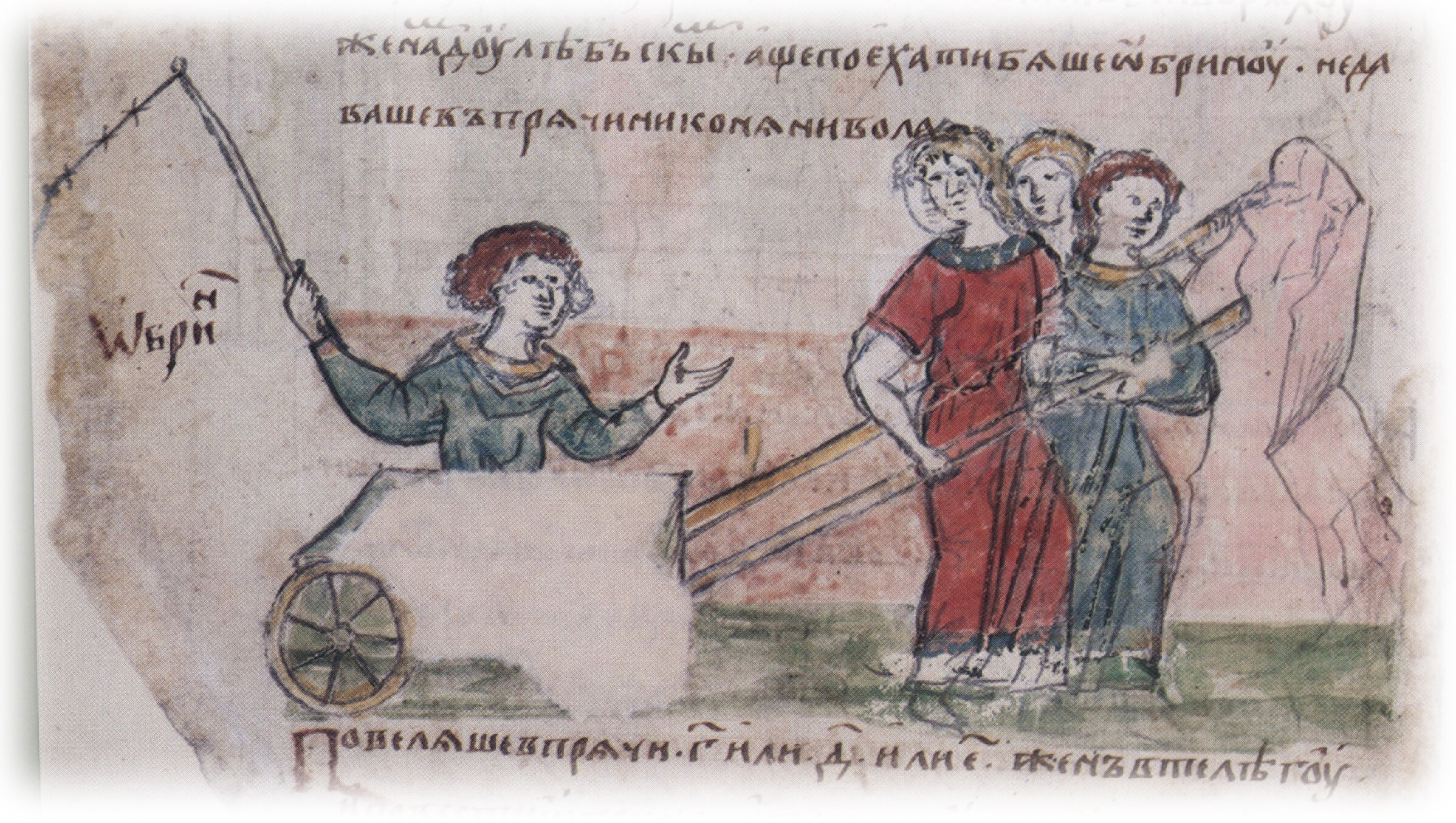 "...примучиша дулебы, сущая словены, и насилье творяху женам дулебьскым; аще поехати бяше обрину, не даваше въпрячи ни коня, ни вола, повеляше впрячи 3, или 4, или 5 жен в телегу и повести обрина..."Слева подпись к рисунку: "Обрин".