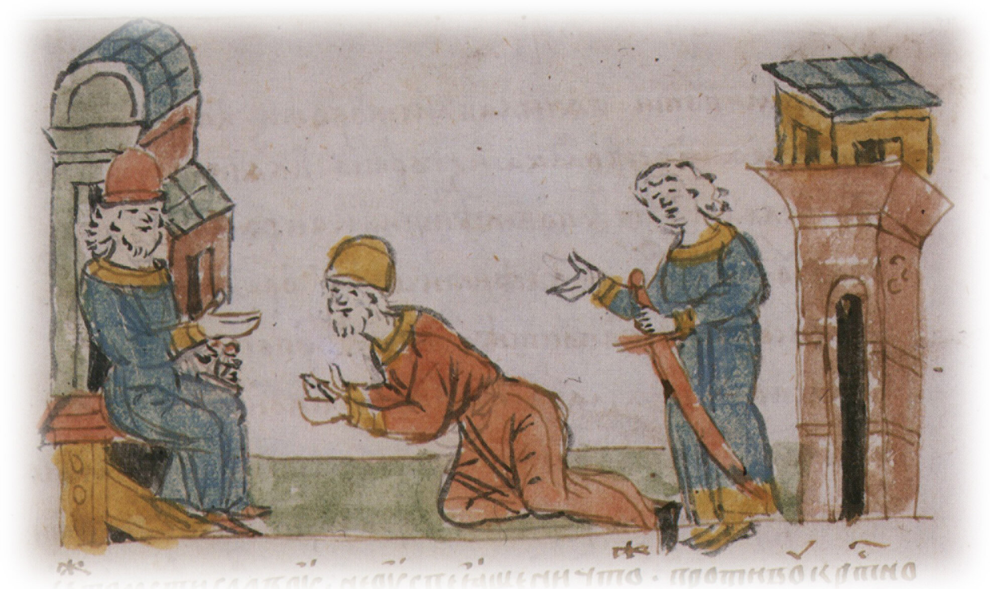 Тайное погребение Владимира Святославича, умершего в Берестове: спуск его тела на землю на ковре между разобранными клетьми здания; положение тела Владимира в мраморный гроб в церкви Святой Богородицы.
