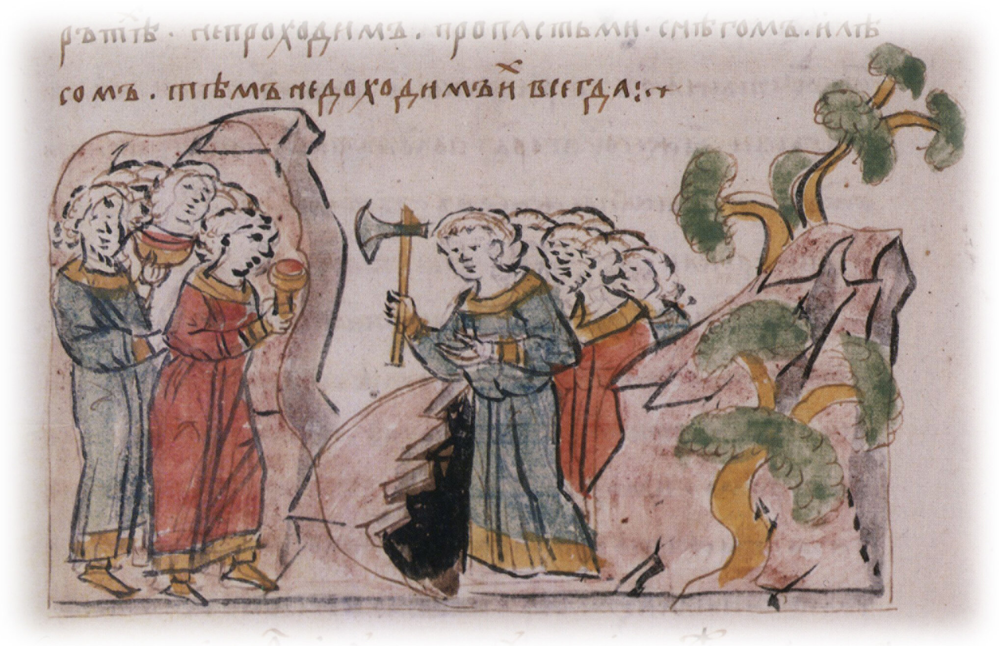 Изображение событий, рассказанных новгородцем Гюрятой Роговичем о людях, заключенных в горе, говорящих на непонятном языке и предлагающих меха в обмен на железо.