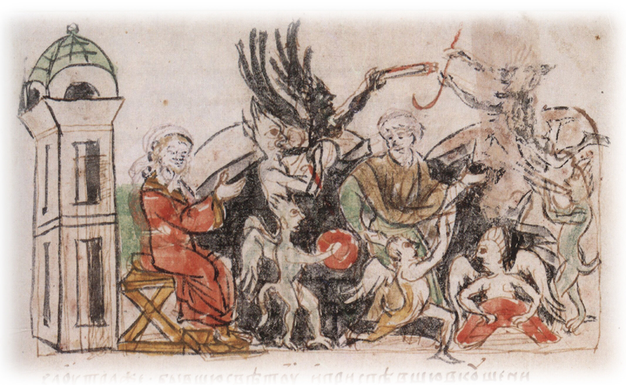 Изображение бесовского игрища с сопелями, бубнами и гуслями в келье черноризца Исакия.