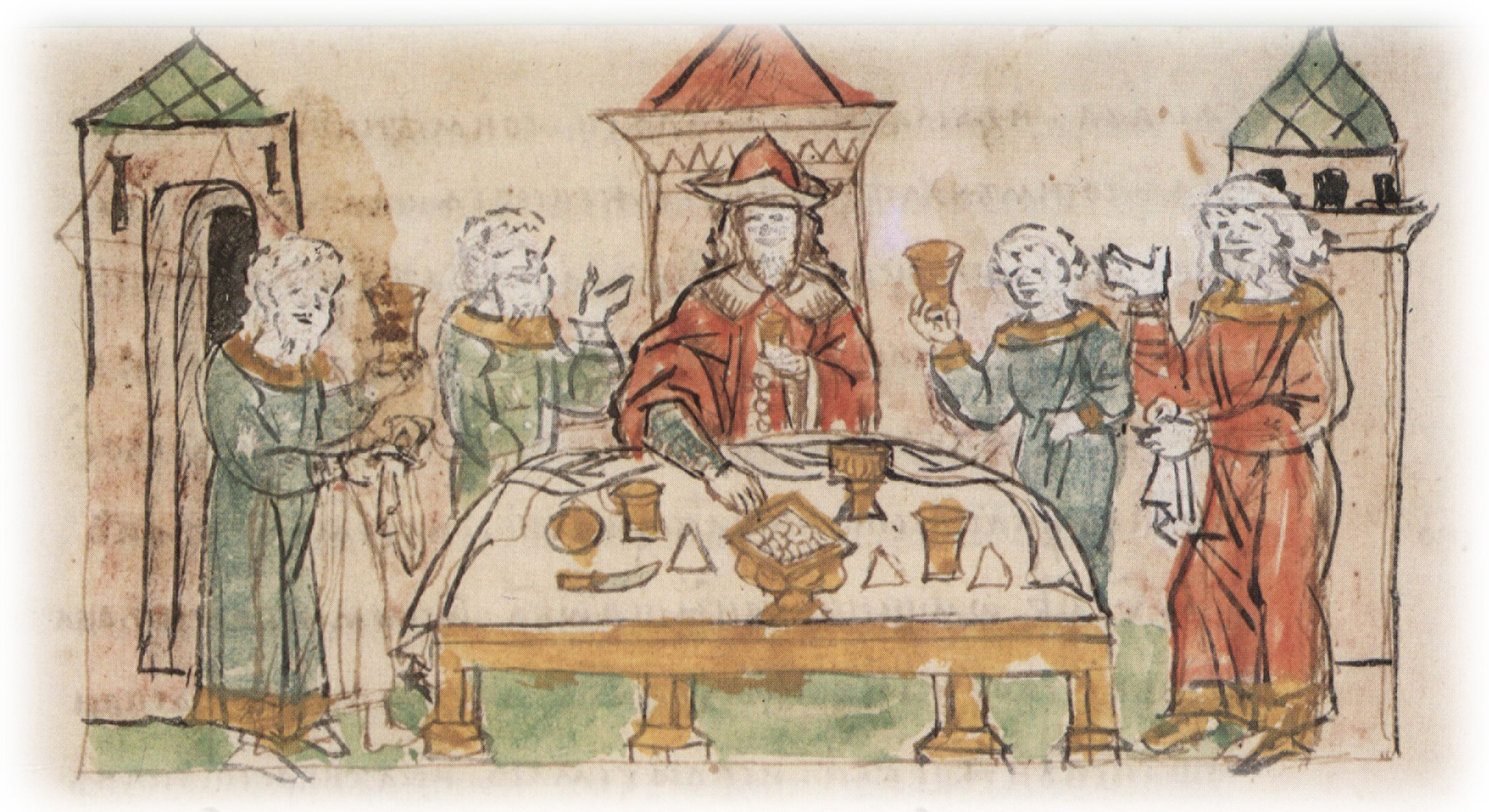 Совместный обед Изяслава Ярославича Киевского, Святослава Ярославича Черниговского и Всеволода Ярославича Переяславского со своими боярами после праздничной литургии. (В миниатюре дан собирательный образ одного князя — Изяслава.)