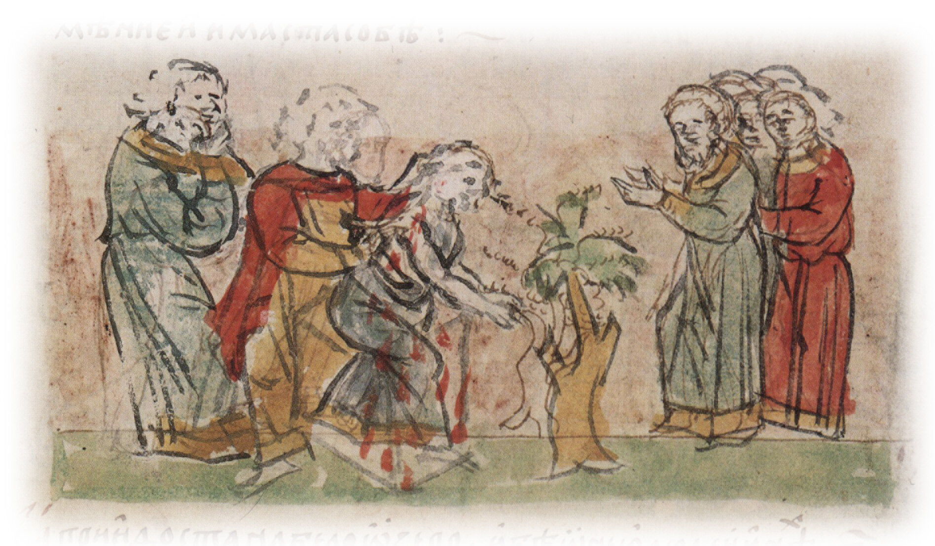Рисунок "мастера Б" — перо. Правлен (фигуры, лица, нож, дерево) "мастера В" — кисть