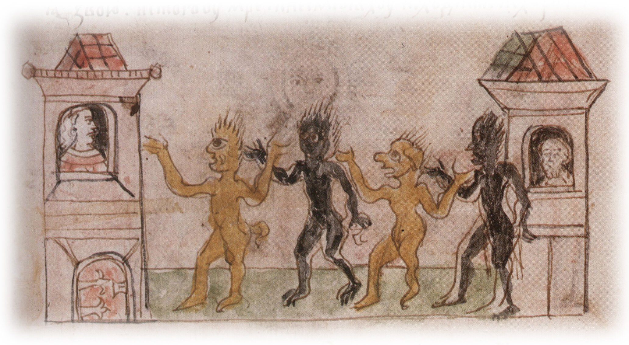 Аллегорическое изображение морового поветрия в Полоцке: бесы, готовые напасть в ночное время на людей, укрывшихся в домах.