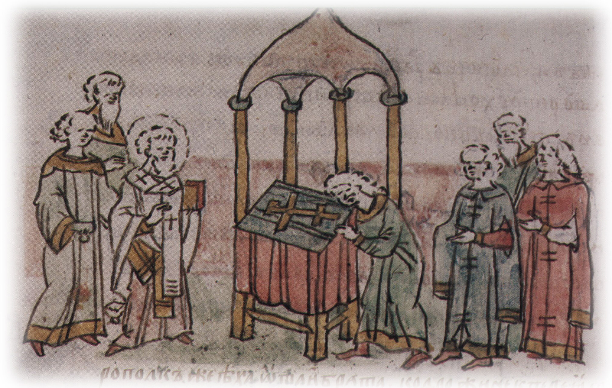 Крестоцелование в присутствии черниговского епископа князей Михалка и Всеволода Юрьевичей и Ярополка и Мстислава Ростиславичей на признание старшинства Михалка.