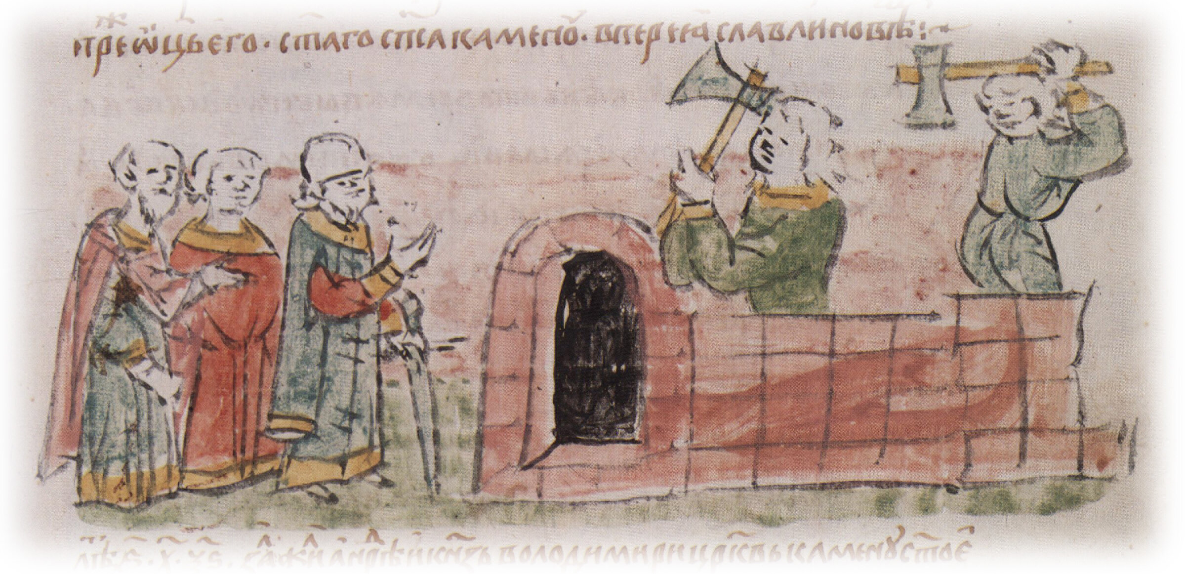 Тайное погребение Владимира Святославича, умершего в Берестове: спуск его тела на землю на ковре между разобранными клетьми здания; положение тела Владимира в мраморный гроб в церкви Святой Богородицы.