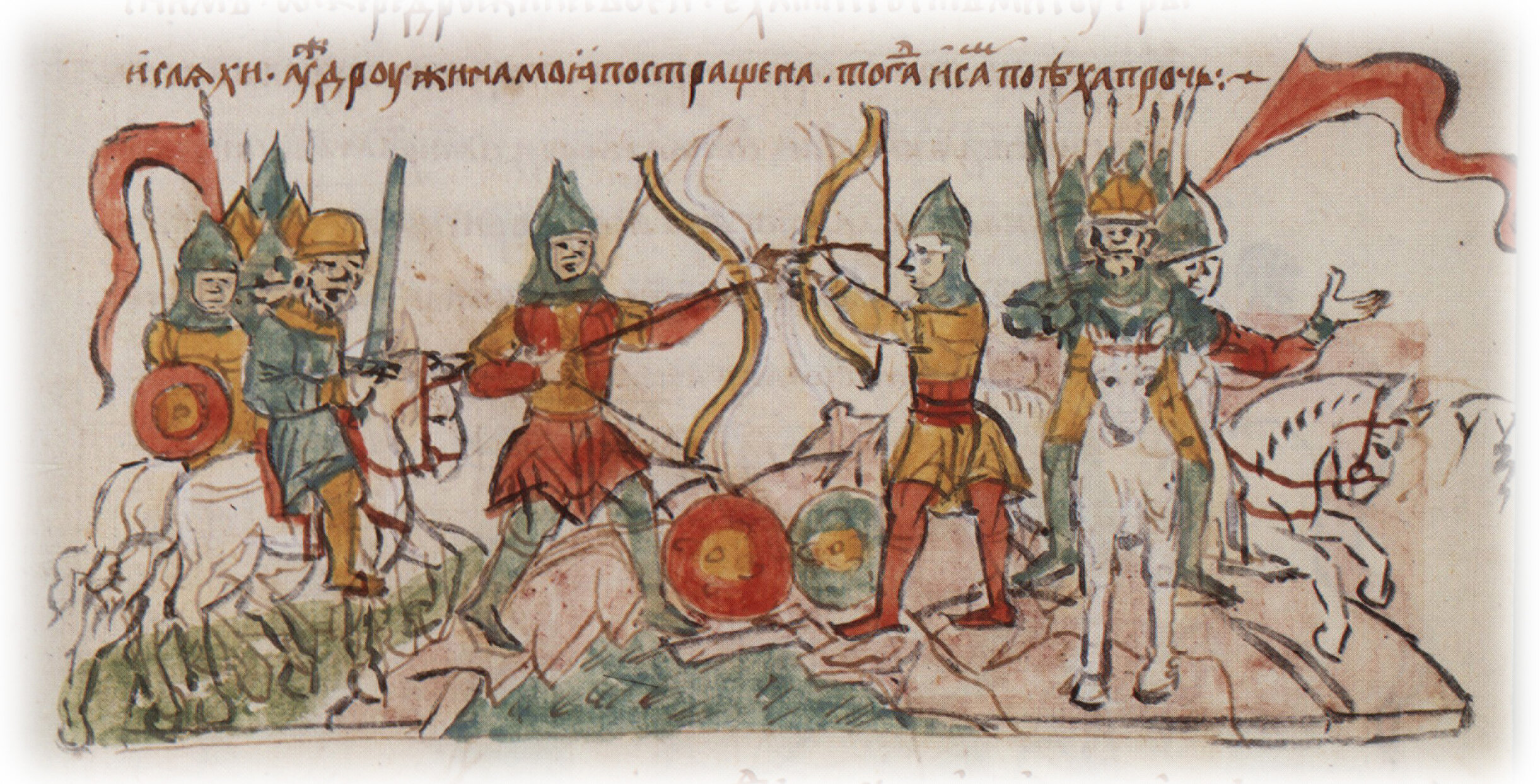 Рисунок "мастера Б" — перо. Правлен (фигуры, лица, шапки, шлемы, щит слева, наконечники копий, луки, лошади, очертания берега) и дополнен (знамена, меч слева, лошадь справа) "мастера В" — кисть. Позднейшая пририсовка сбруи и стремени — перо.