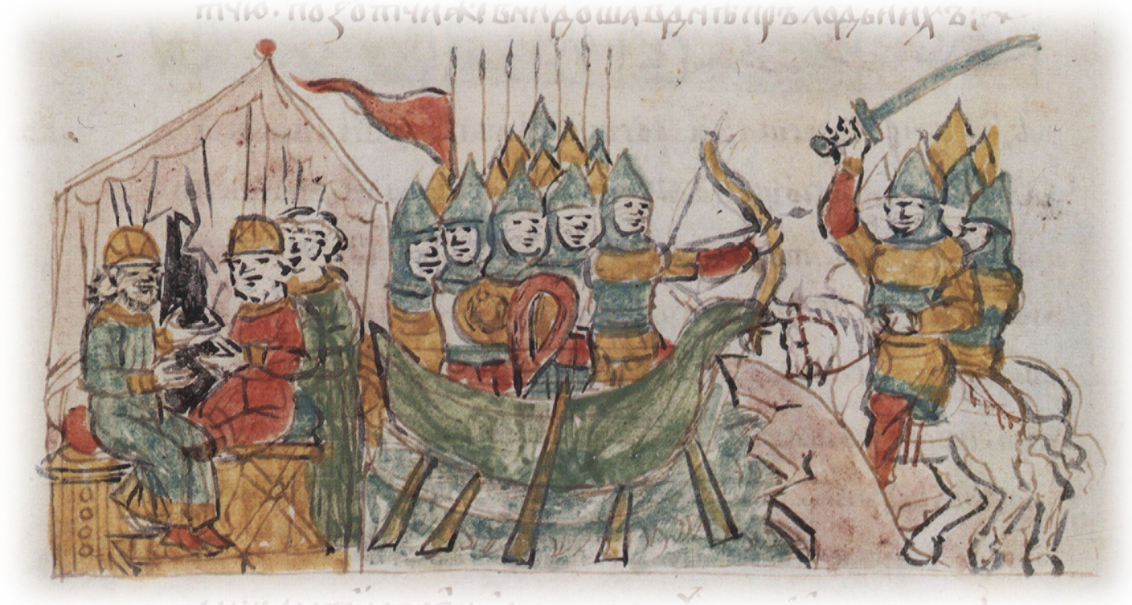 "...и сташа шатры противу Киеву по лугови... и не дадящу вбрести в Днепр, бьяхуться межи собою ездячи в лодьях. ...бе бо исхитрил Изяслав лодьи хитро и дивно... и камо же хотяху, тамо идяху, не обрачающе лодьями".