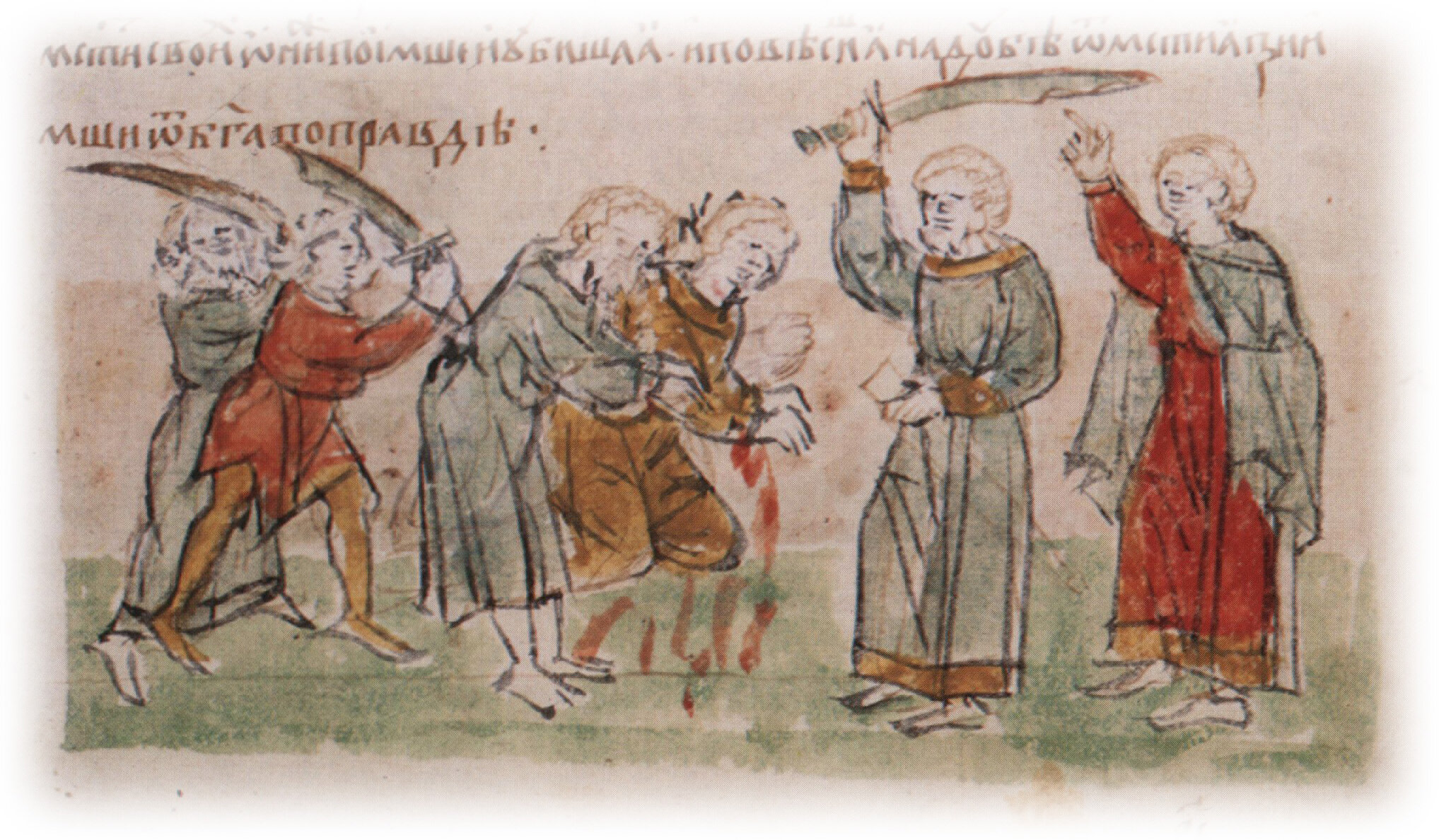 "И рече Янь ко позником: «Ци кому вас кто родин убьен от сею?» Они же реша: «Мне мати, другому сестра, иному рожение». Он же рече им: «Мстите своих». Они же поимше и убиша а...".